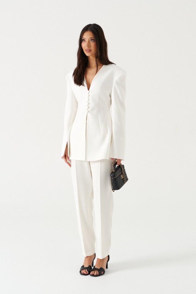 Брюки прямые, длинные зауженные к низу, выполнены из костюмной ткани молочного цвета. Характеристика: