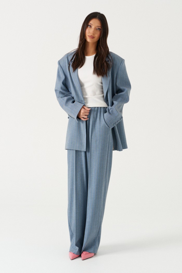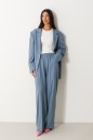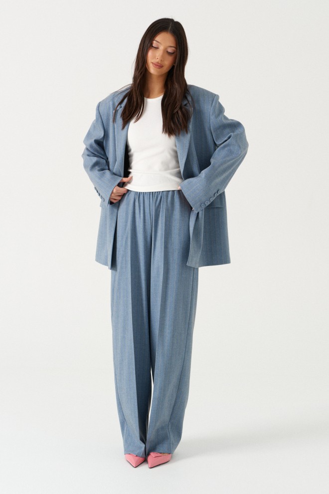 Брюки прямого кроя выполнены из костюмной ткани голубого цвета в узкую бежевую полоску. Характеристики: прямой крой, пояс на широкой резинке, боковые карманы, на передних и задних частях брюк заутюжены стрелки, без подкладки. Длина брюк по боковому шву 112 см.