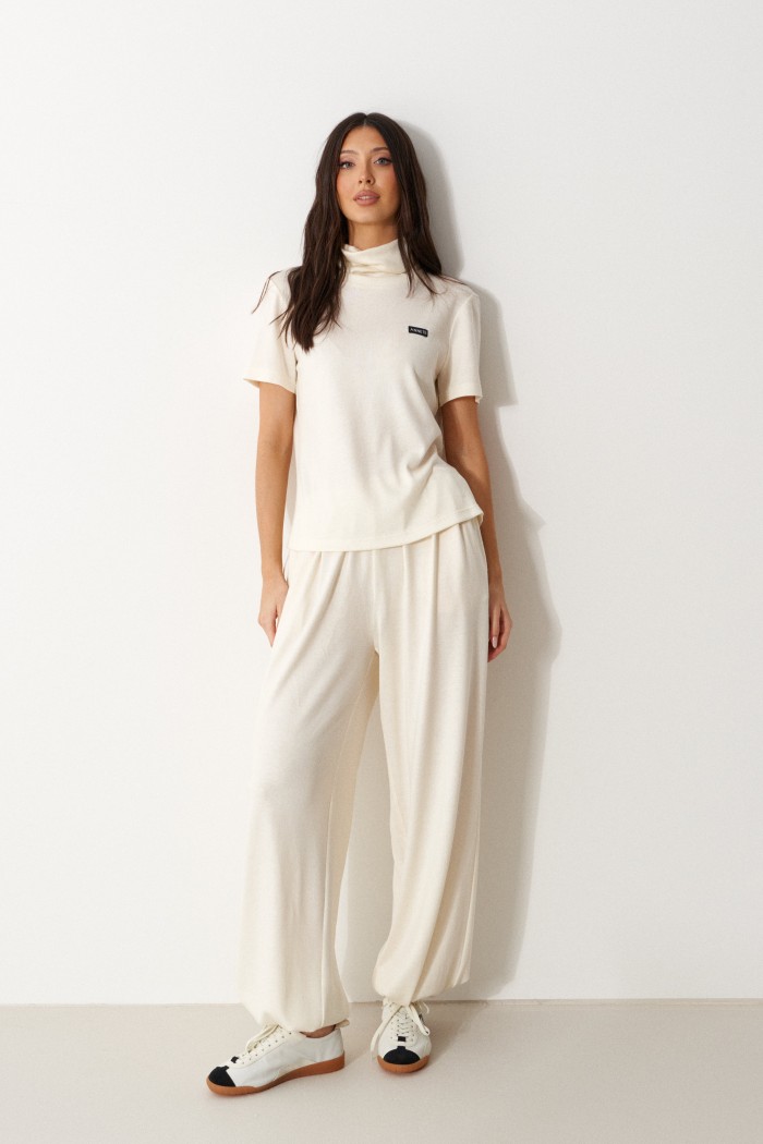 Брюки-джоггеры выполнены из трикотажного полотна молочного цвета. Характеристики: прямой крой, пояс на шнурке-резинке с фиксатором, в боковых швах карманы, штанина внизу на резинке с фиксатором. Длина 105 см.