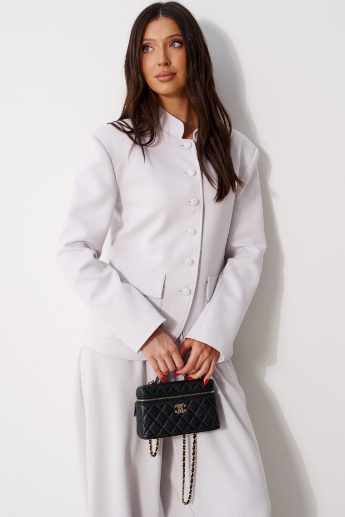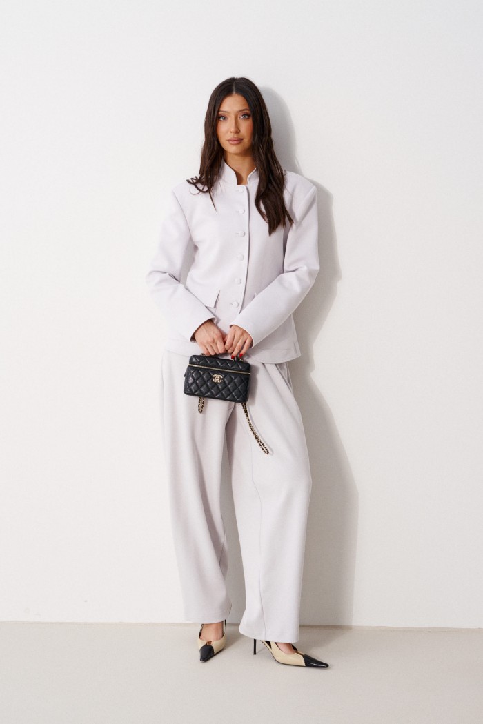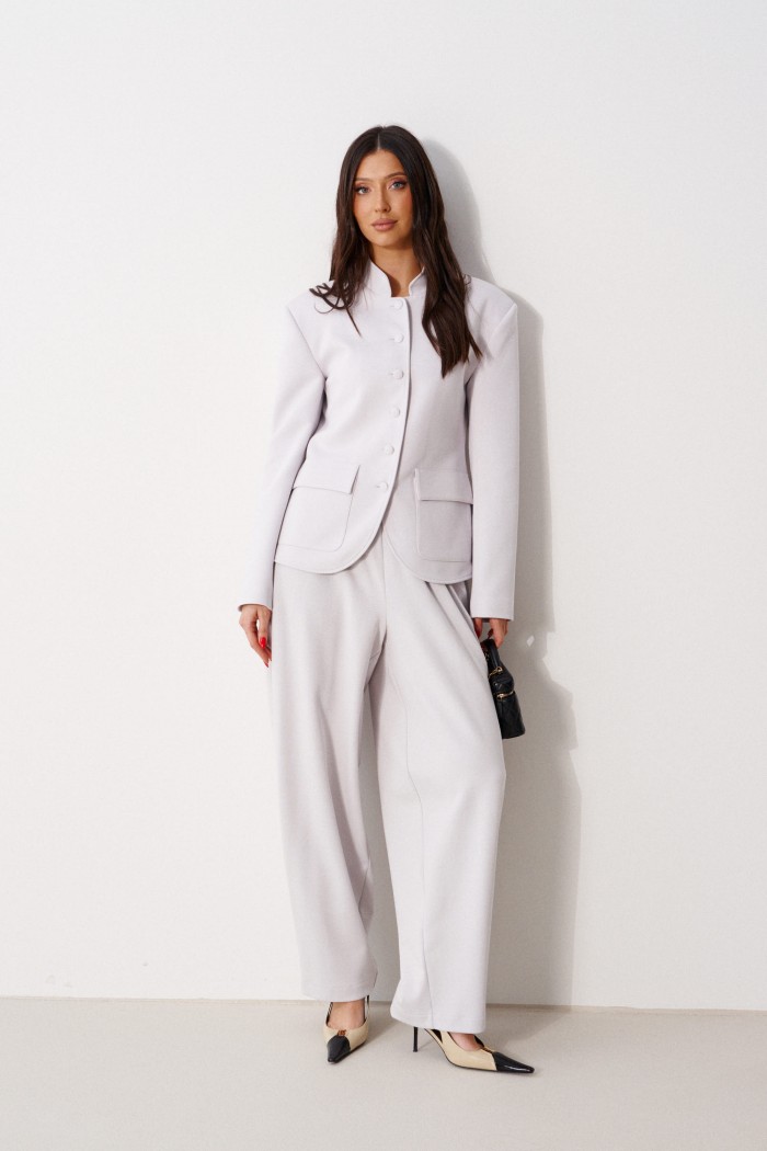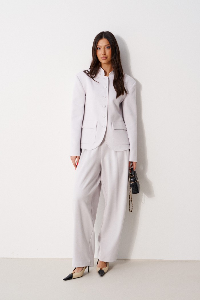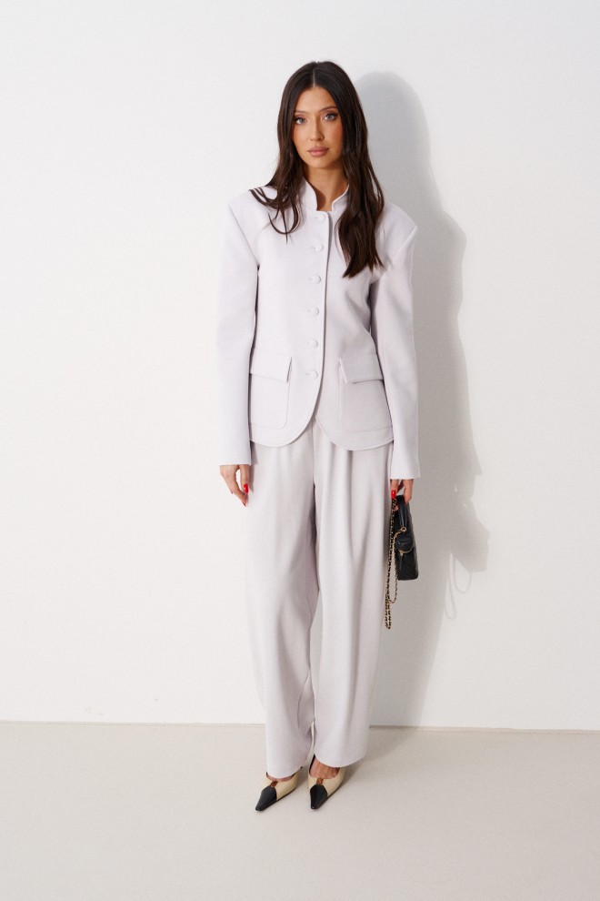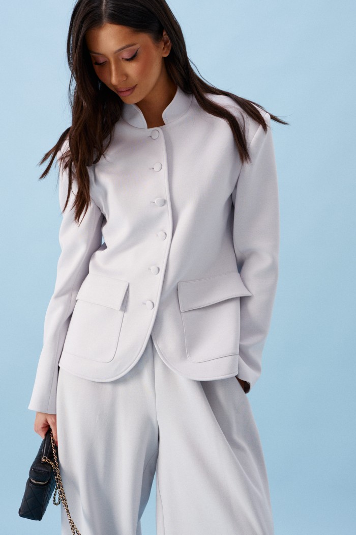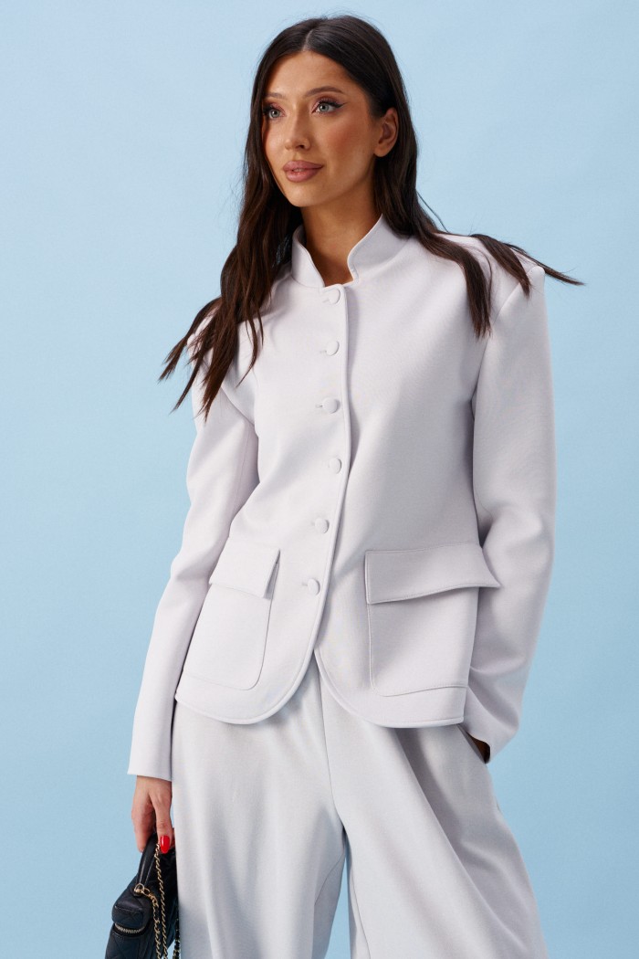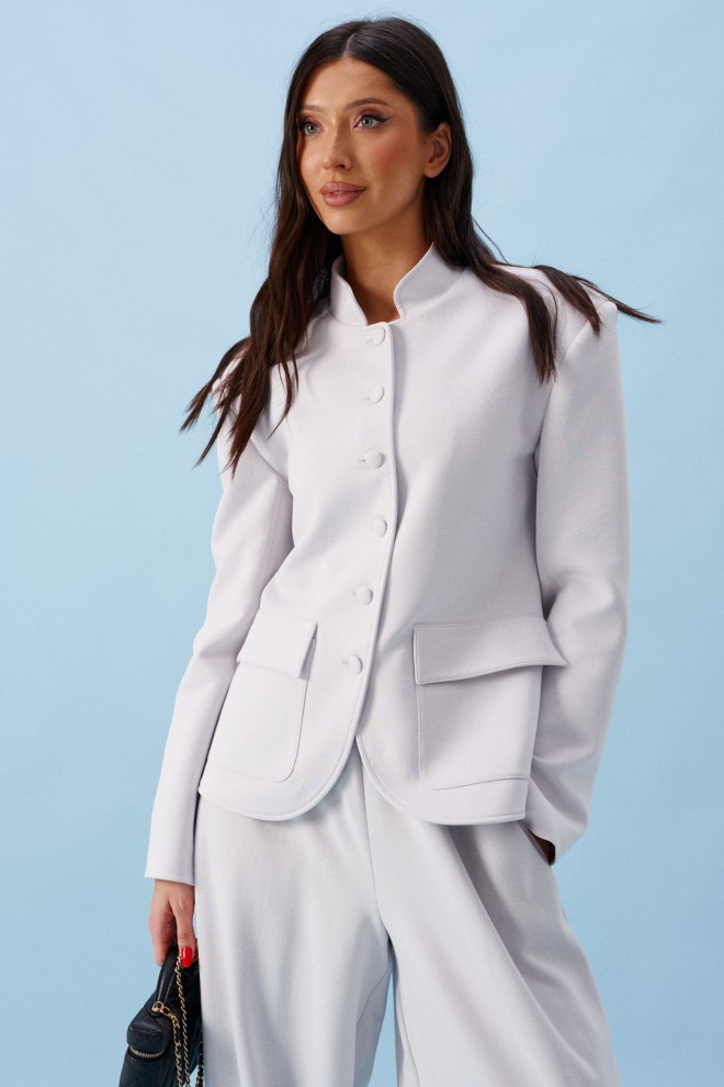 Жакет прямого кроя, выполнен из трикотажного полотна серого цвета. Характеристики: прямой крой, на брендированной подкладке, вырез горловины круглый с притачным воротником-стойкой, накладные карманы с клапанами, спинка цельная, рукав втачной, застежка центральная бортовая, застегивающаяся на пробивные петли и пришивные пуговицы. Длина рукава 63см. Длина изделия 62см.