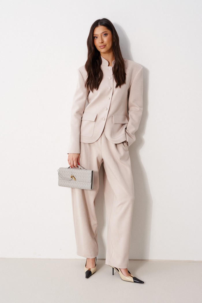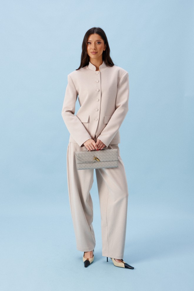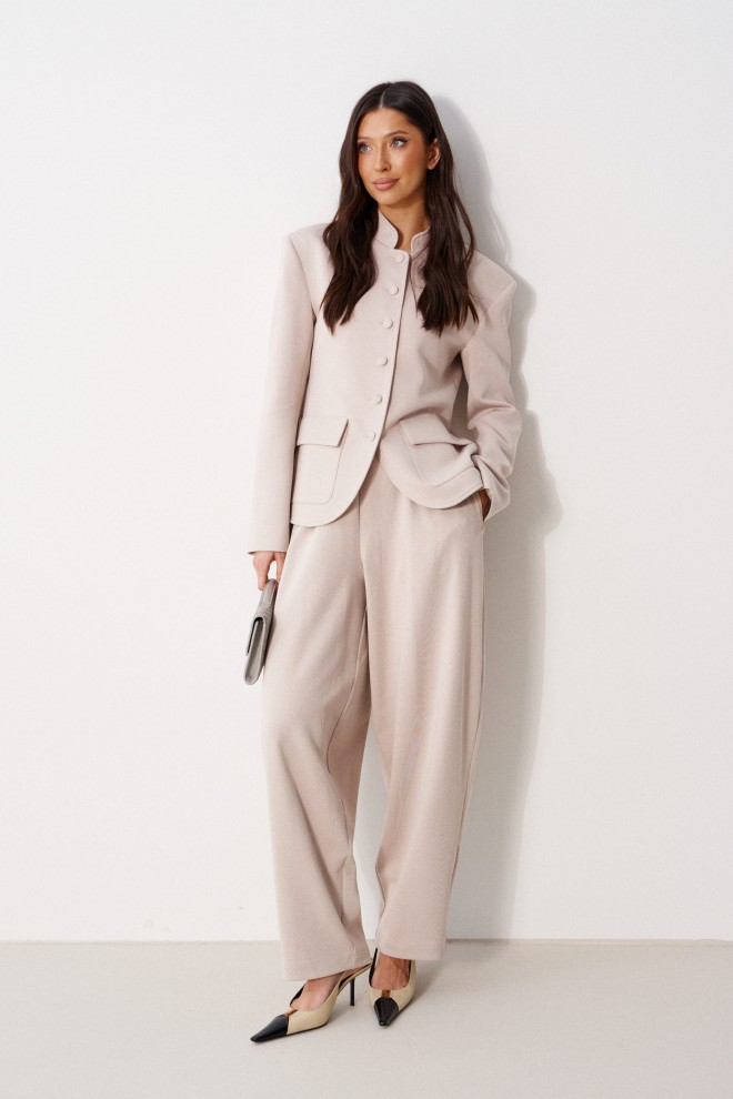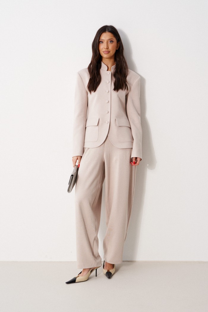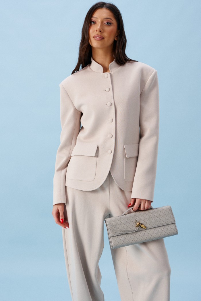 Жакет прямого кроя, выполнен из трикотажного полотна молочного цвета. Характеристики: прямой крой, на брендированной подкладке, вырез горловины круглый с притачным воротником-стойкой, накладные карманы с клапанами, спинка цельная, рукав втачной, застежка центральная бортовая, застегивающаяся на пробивные петли и пришивные пуговицы. Длина рукава 63см. Длина изделия 62см.