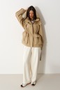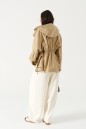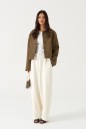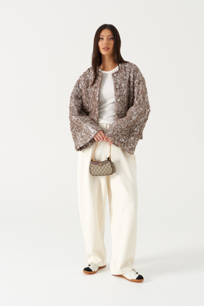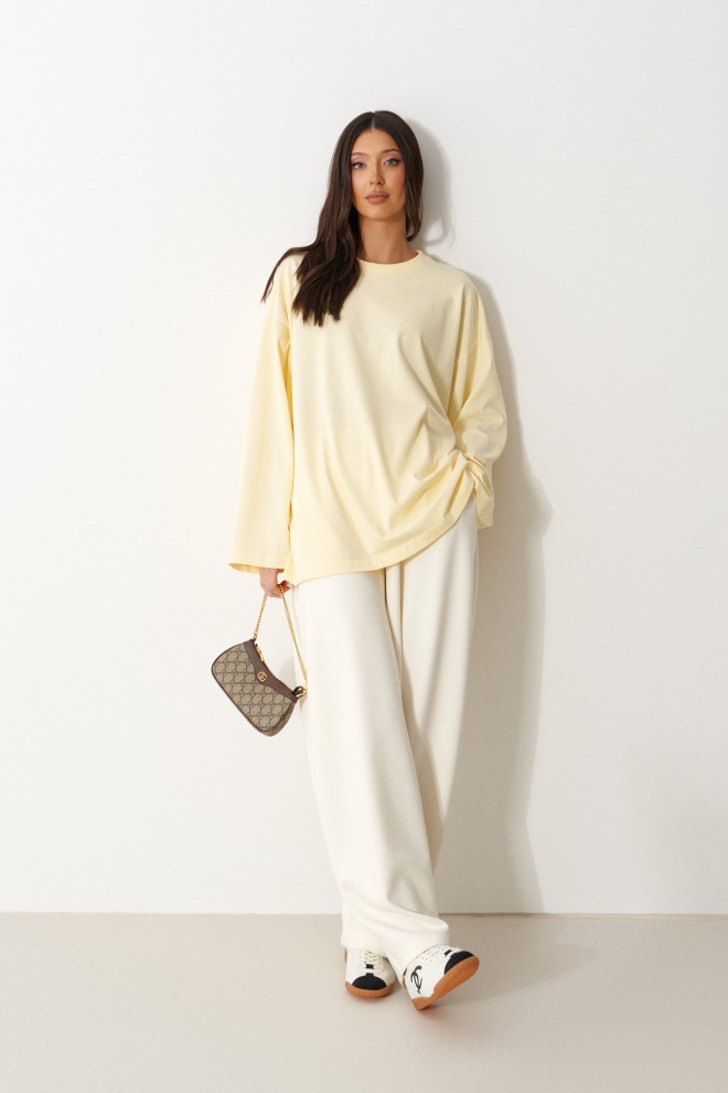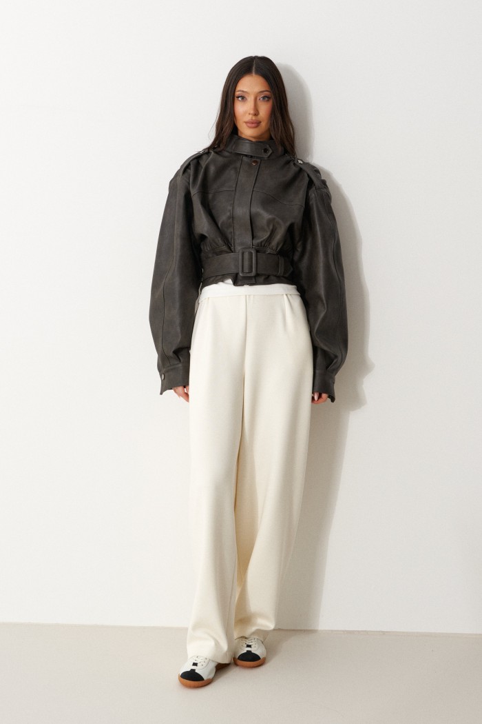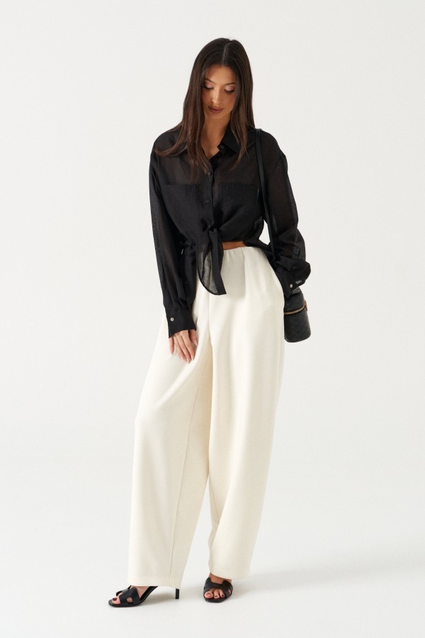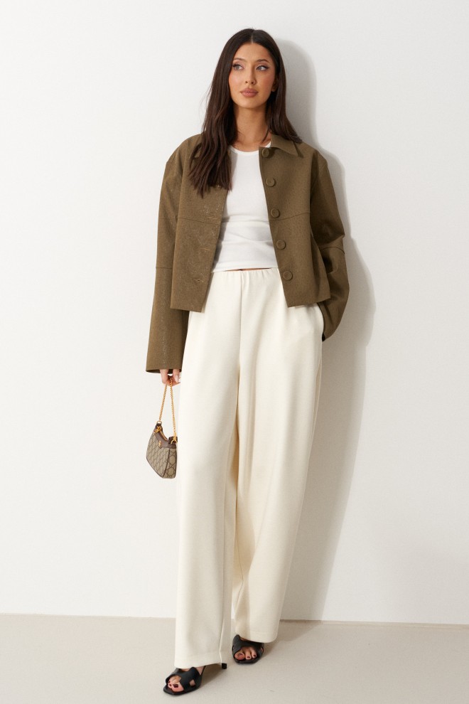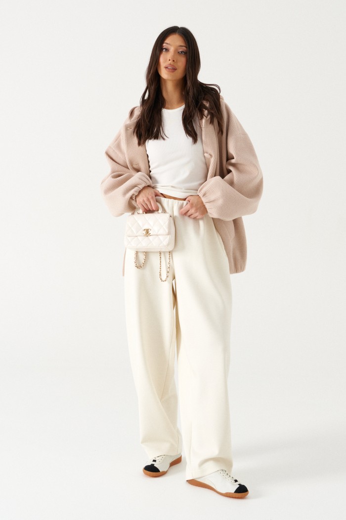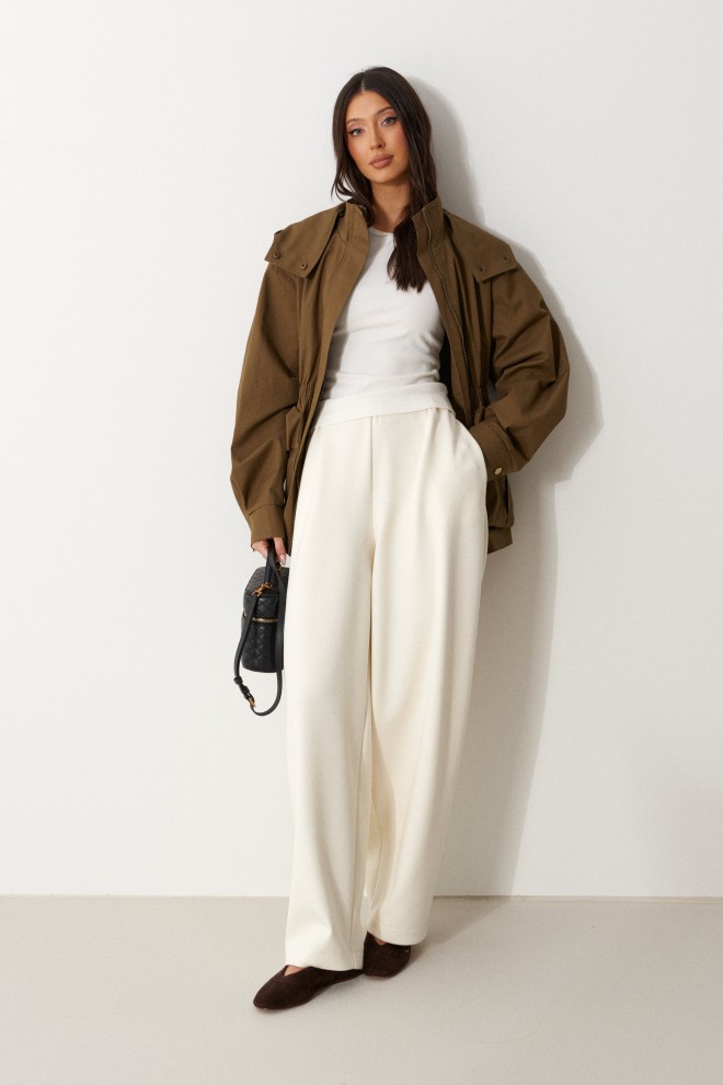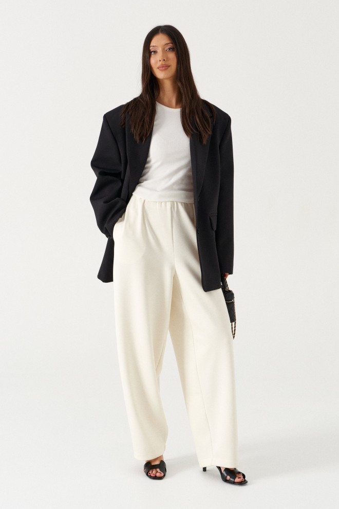 Брюки свободного кроя. Выполнены из плотного трикотажа молочного (тёпло-белого) цвета. Без подкладки. Пояс на резинке. В боковых швах карманы. По задней части накладные карманы. Брюки заужены к низу. Длина бокового шва 105 см