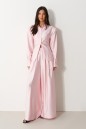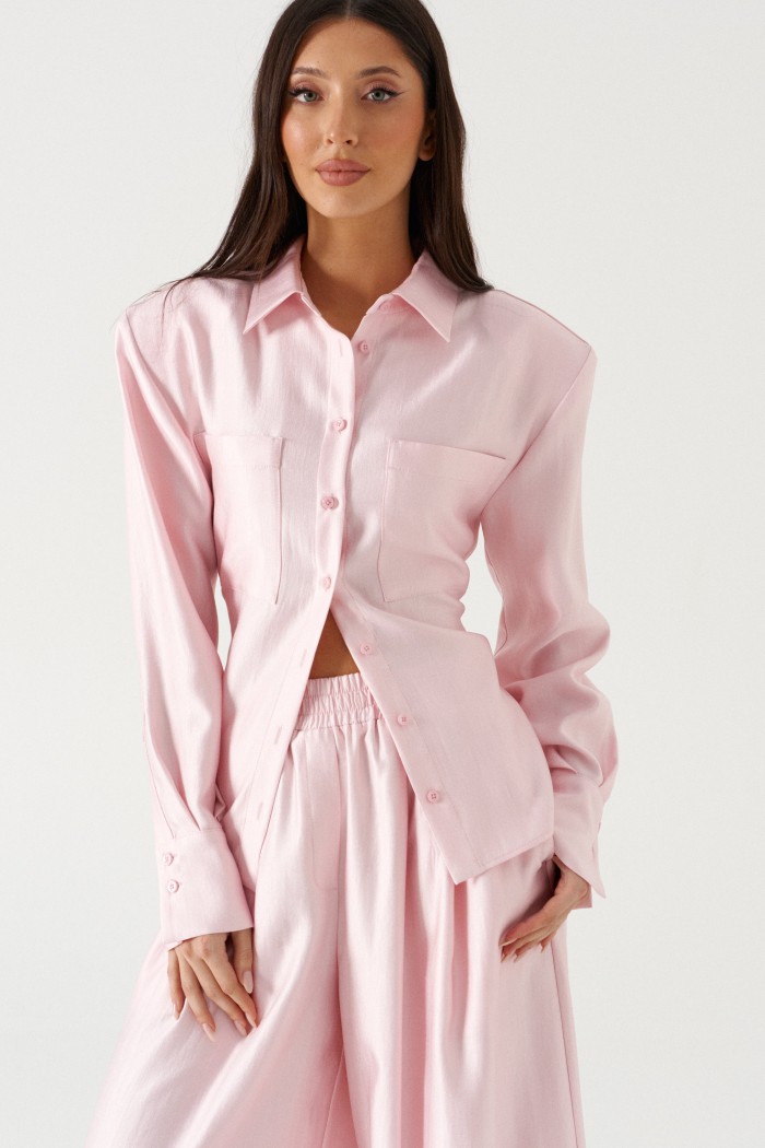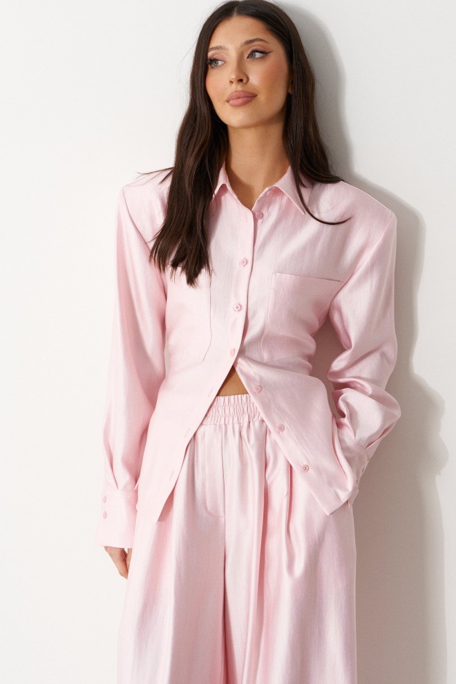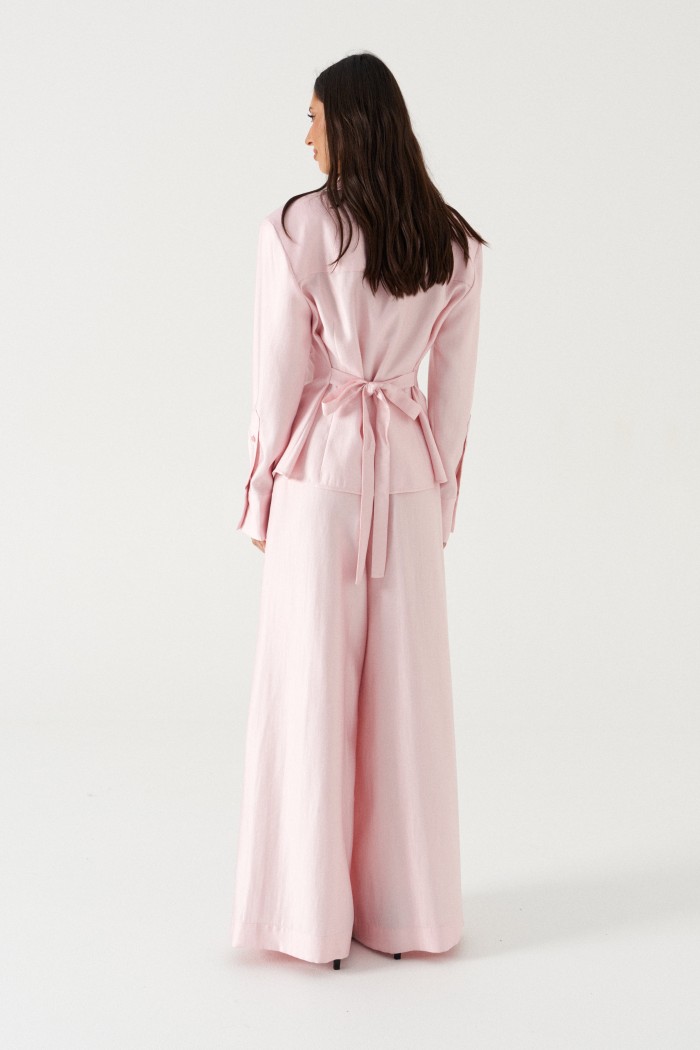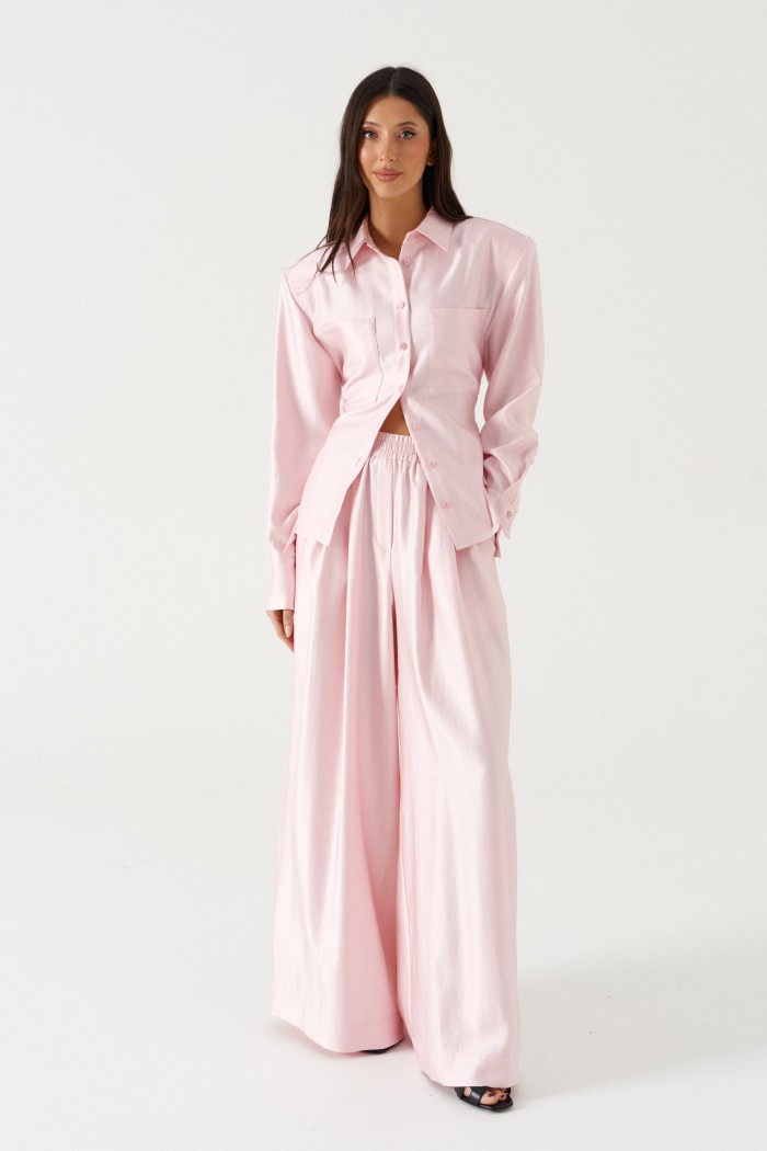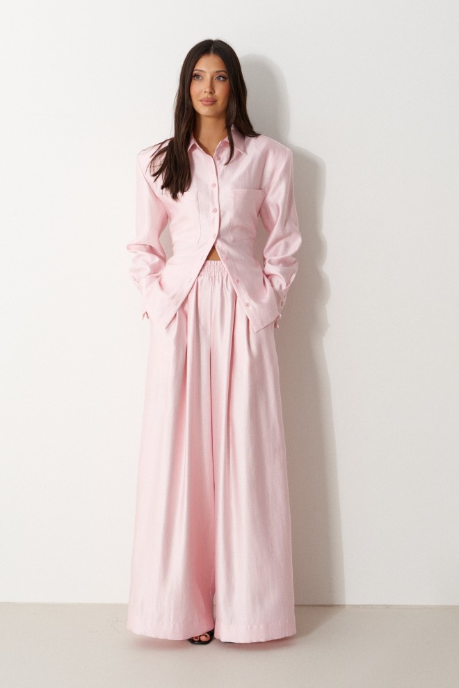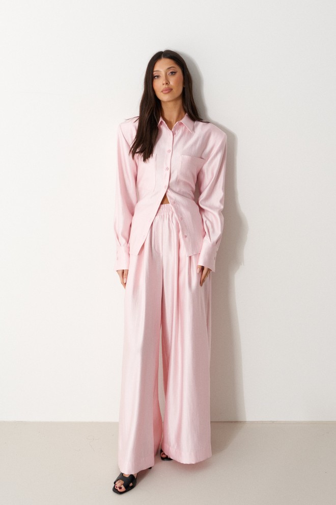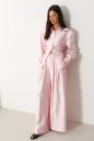 Брюки прямого свободного кроя. Выполнены из текстильного полотна нежно-розового цвета с мягким блеском. Без подкладки. Пояс на резинке. По переду имитация застёжки. Наклонные карманы. Длина бокового шва (с учетом пояса) 110 см