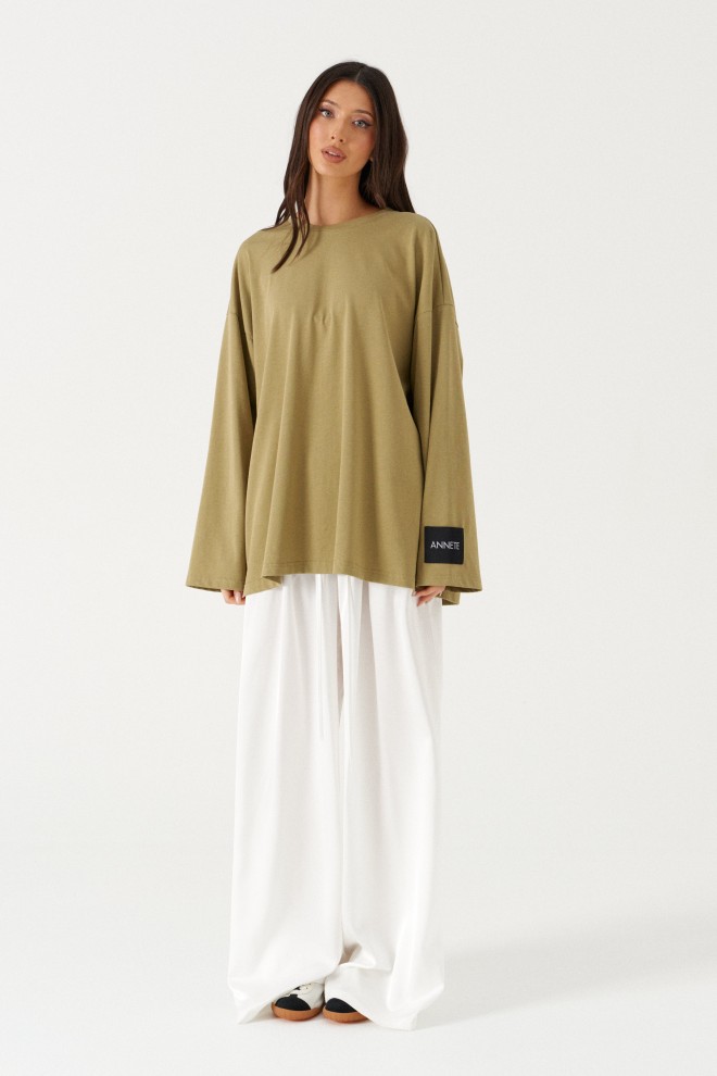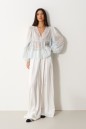 Брюки свободного кроя. Выполнены из мягкой струящейся ткани белого цвета. Пояс на резинке, со шнурочком. В боковых швах карманы. Длина бокового шва (с учётом пояса) 107 см