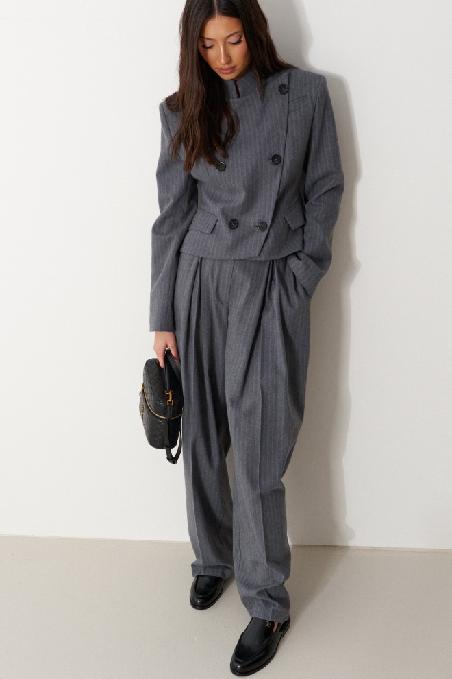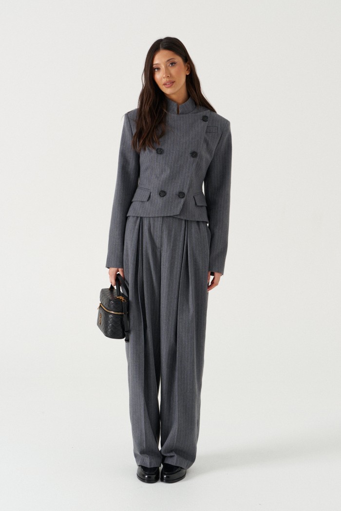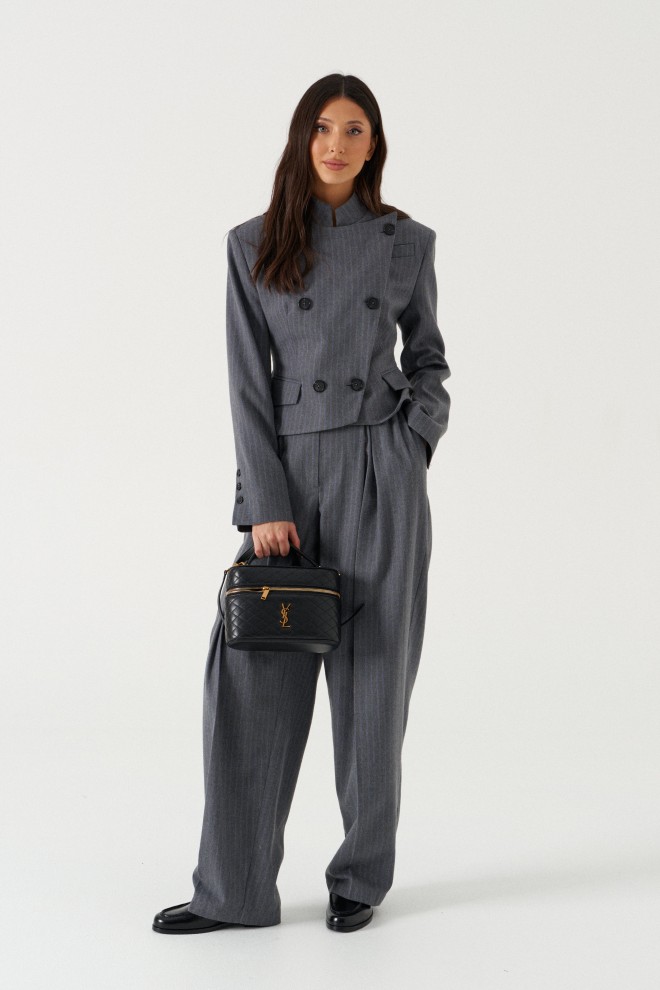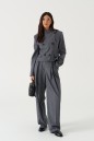 Брюки свободного кроя, выполнены из текстильной, чуть ворсистой, ткани. Характеристика: свободный крой, пояс частично на резинке, застежка центральная на пуговицу и замок, скрывающийся под гульфиком, спереди есть защипы, без подкладки, в боковых швах карманы. Длина изделия по боковому шву 112см.