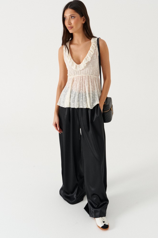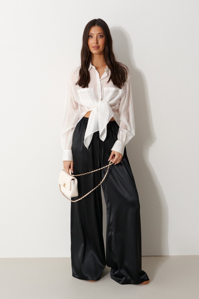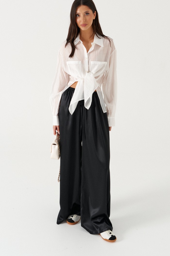 Брюки свободного кроя. Выполнены из мягкой струящейся ткани чёрного цвета. Пояс на резинке, со шнурочком. В боковых швах карманы. Длина бокового шва (с учётом пояса) 107 см