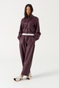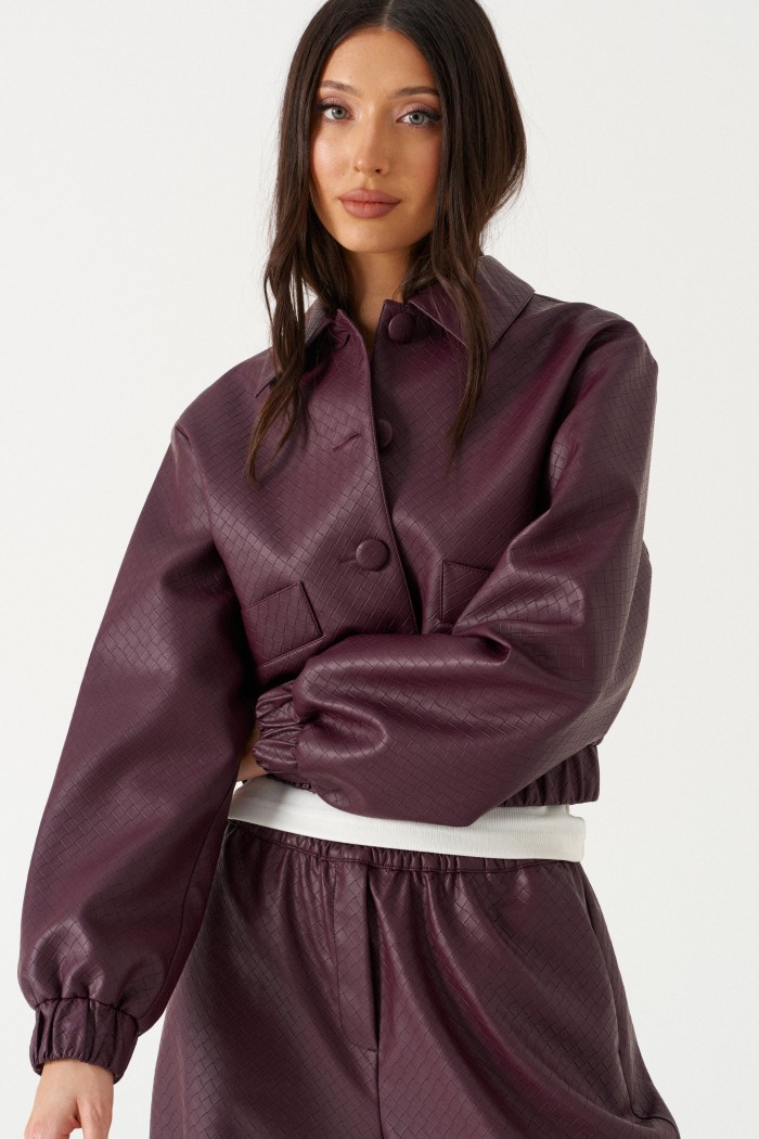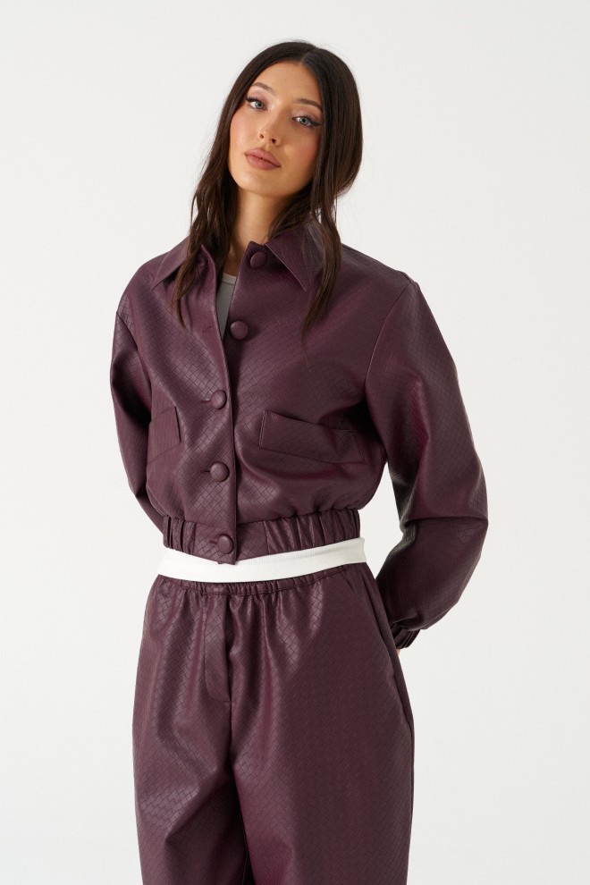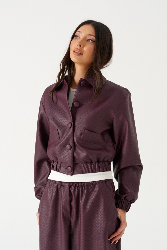 Брюки прямого кроя, выполнены из фактурной эко-кожи бордового цвета. Характеристика: прямой крой, пояс на резинке, спереди есть имитация гульфика, без подкладки, в боковых швах карманы. Длина изделия по боковому шву 96 см.