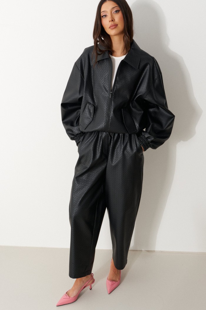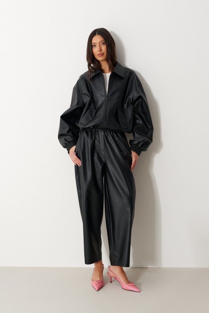 Брюки прямого кроя, выполнены из фактурной эко-кожи черного цвета. Характеристика: прямой крой, пояс на резинке, спереди есть имитация гульфика, без подкладки, в боковых швах карманы. Длина изделия по боковому шву 96 см.