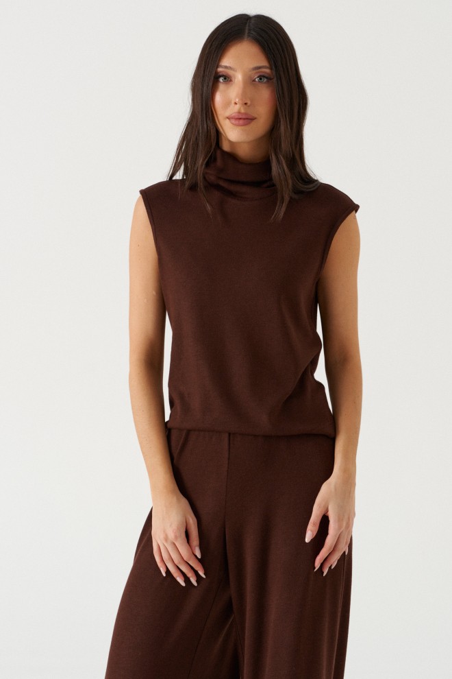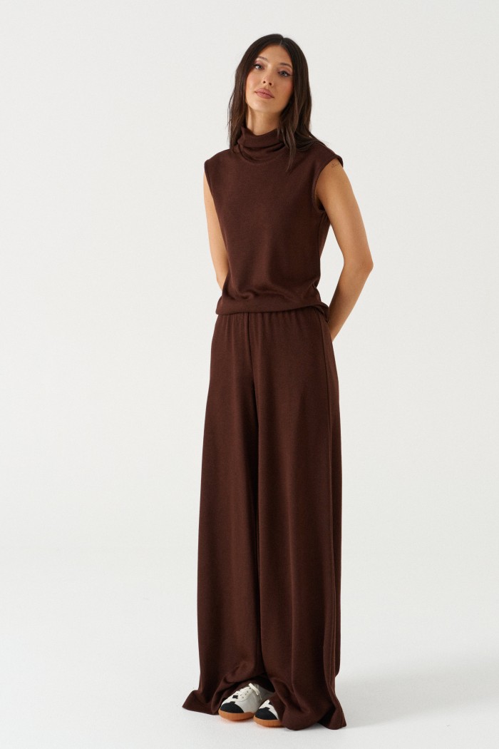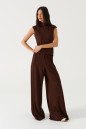 Брюки свободного кроя, выполнены из мягкого трикотажа коричневого цвета. Характеристика: свободный крой, пояс на резинке. Длина по боковому шву (с поясом) 114 см.