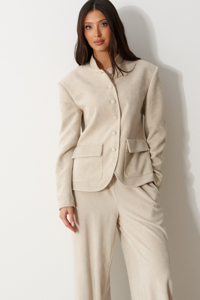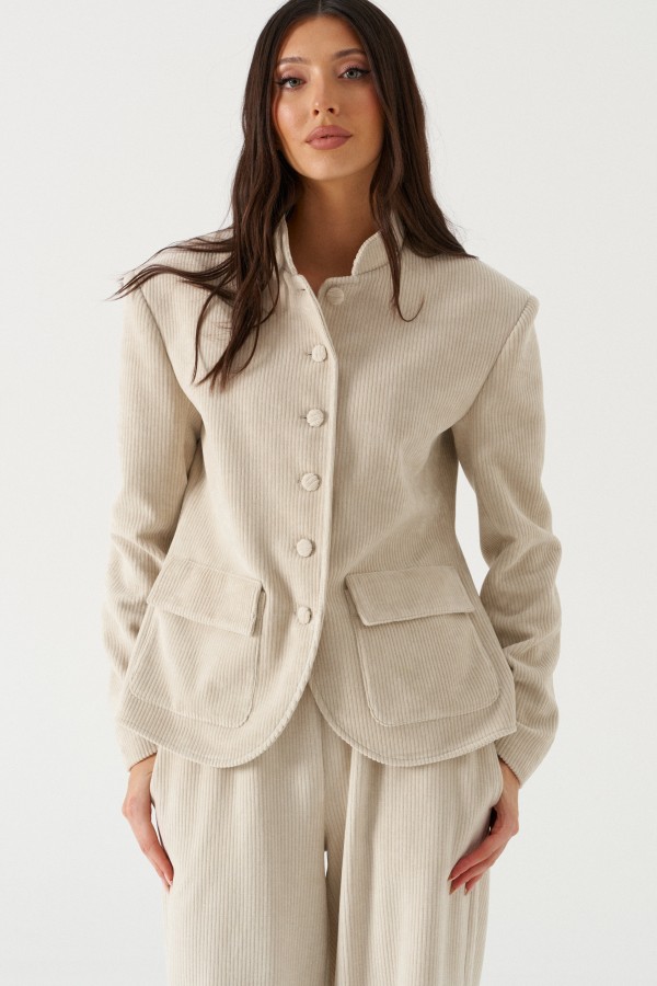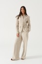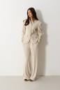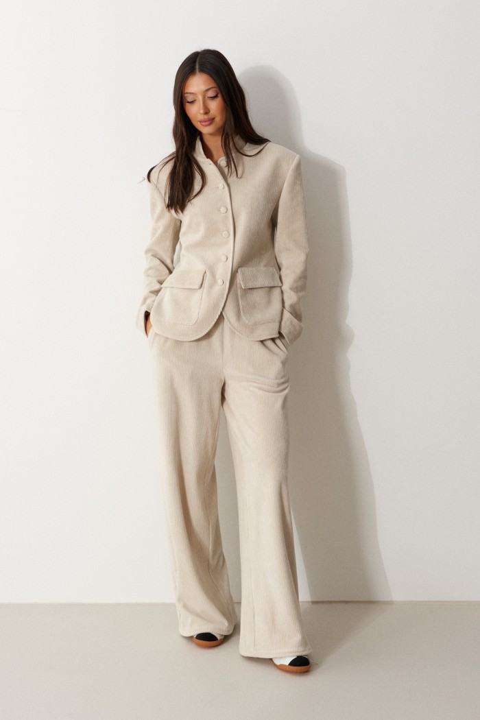 Брюки свободного кроя. Выполнены из штруксовой ткани (вельвет) светло-бежевого цвета. Пояс на резинке. В боковых швах карманы. Сзади накладные карманы.