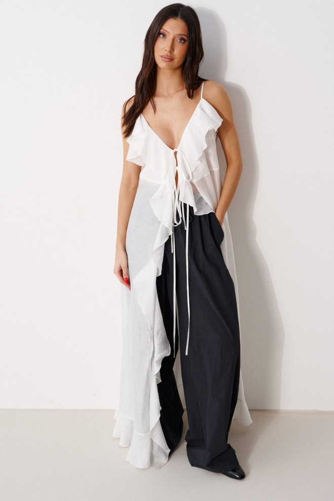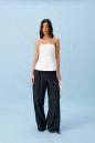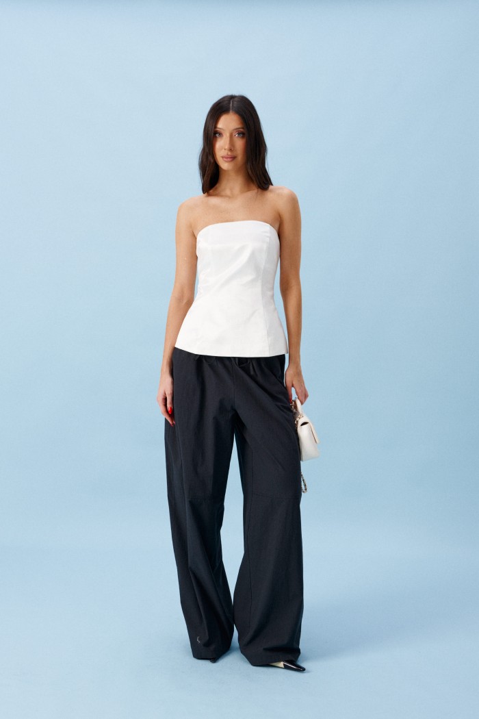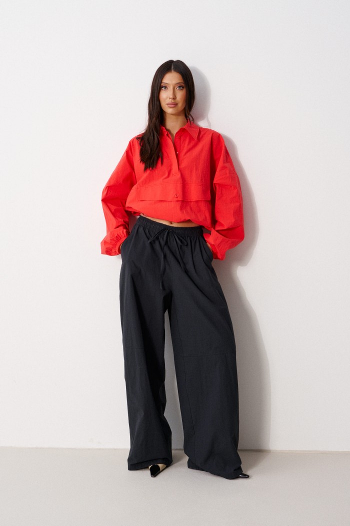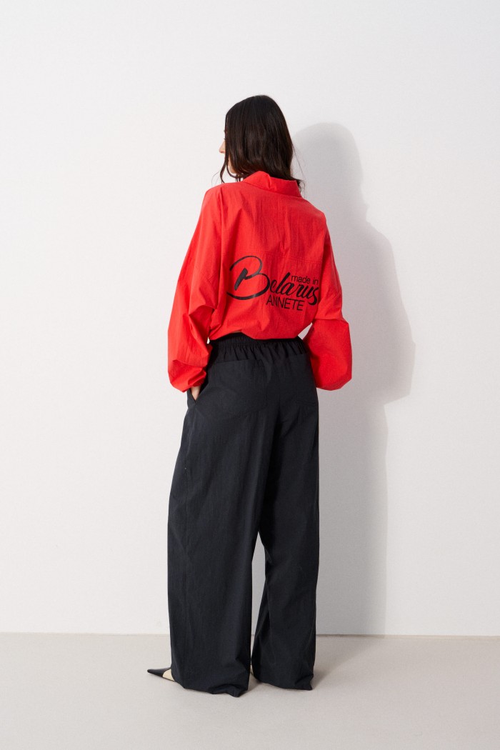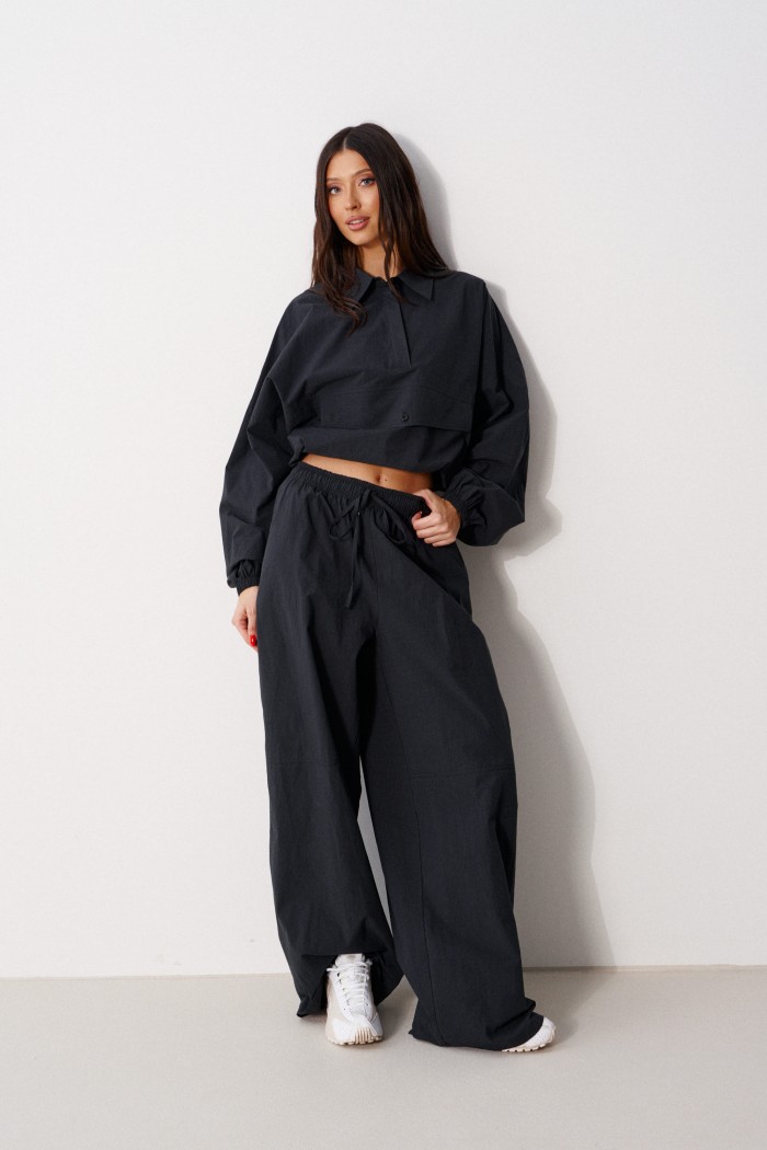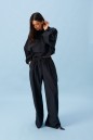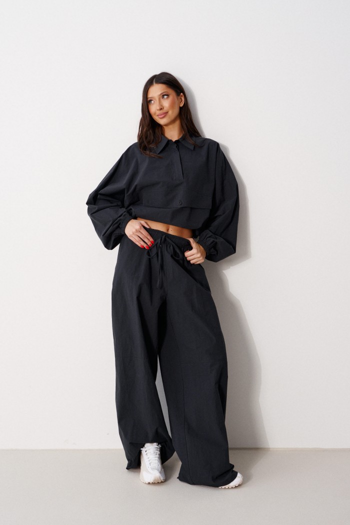 Брюки прямого кроя, выполнены из хлопкового полотна черного цвета. Характеристика: свободный крой, пояс на резинке со шнурочком, в боковых швах карманы, сзади изделия накладные функциональные карманы. Передние половины брюк разделены швом с отделочными строчками на уровне середины бедра. Длина по боковому шву 104 см.
