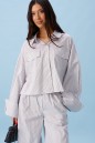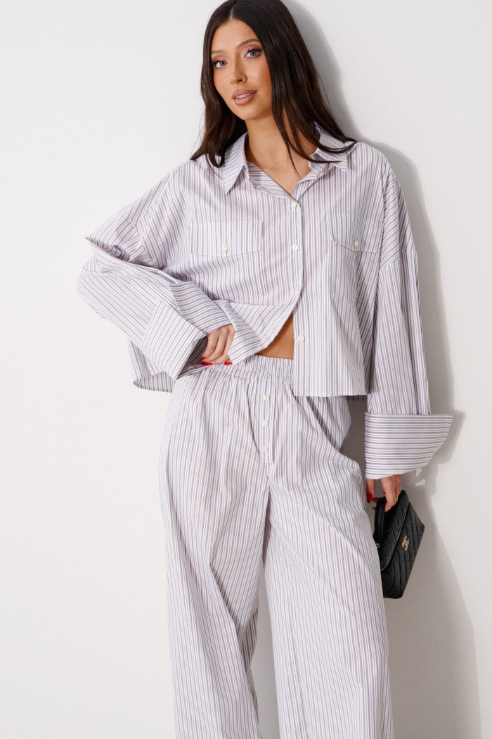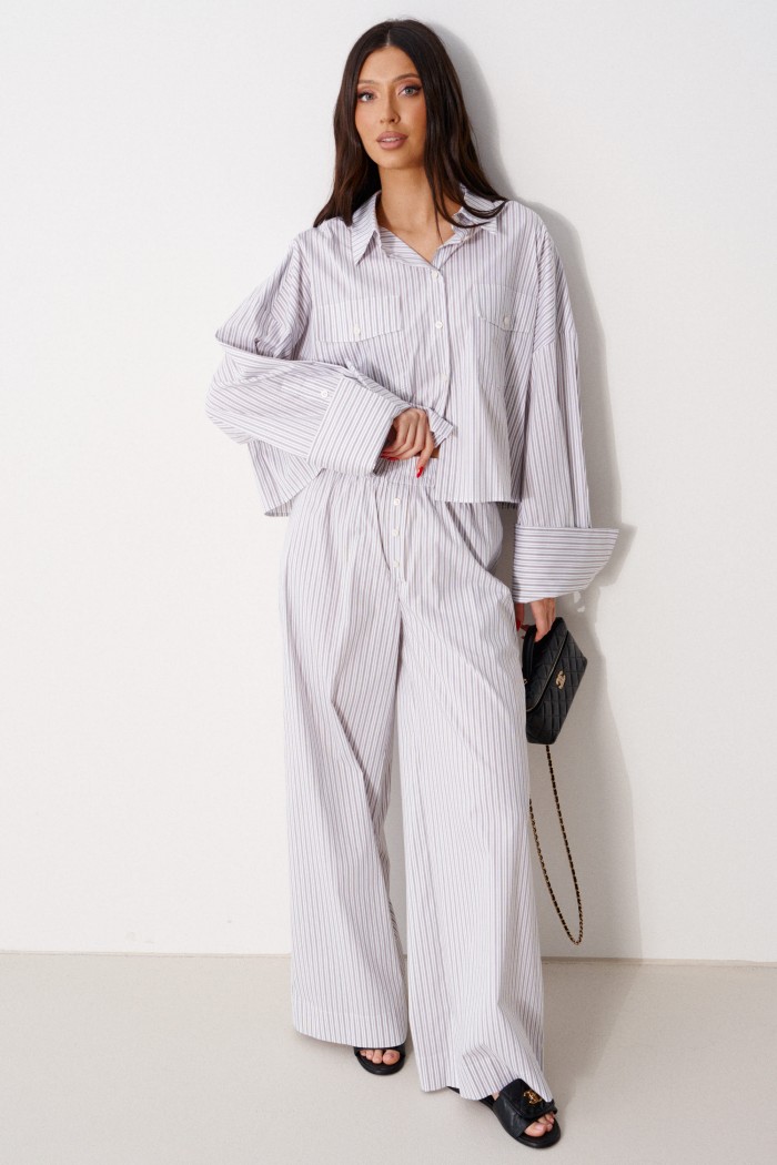 Брюки свободного кроя. Выполнены из хлопковой (смесовой) ткани белого цвета с полоской синей, коричневой. Пояс на резинке. По переду имитация застёжки. В боковых швах карманы. Длина с учётом пояса 108 см
