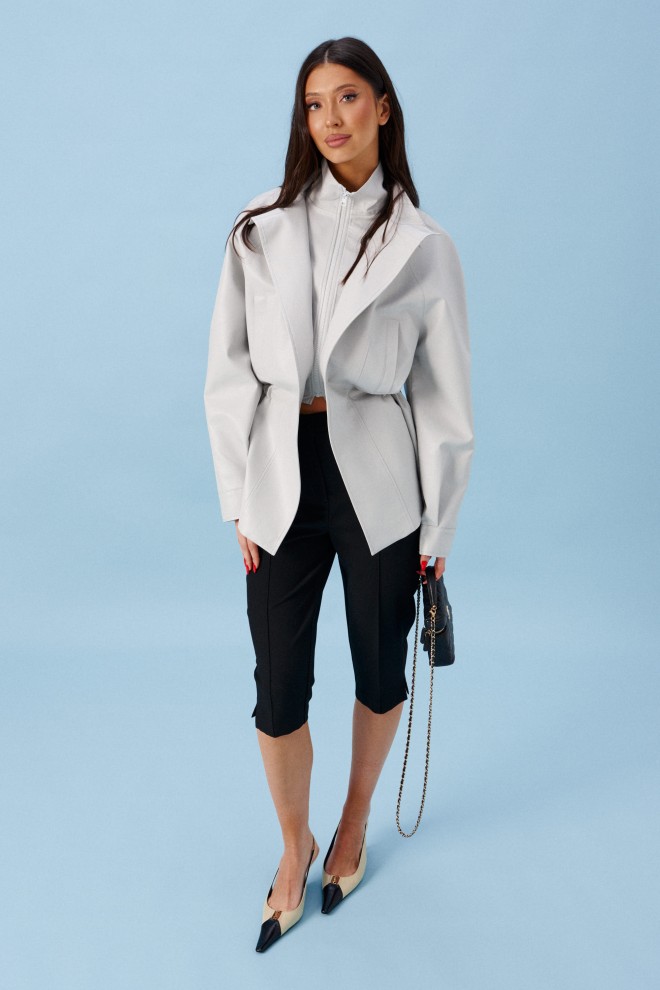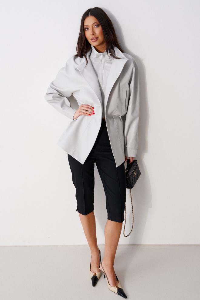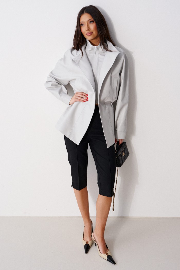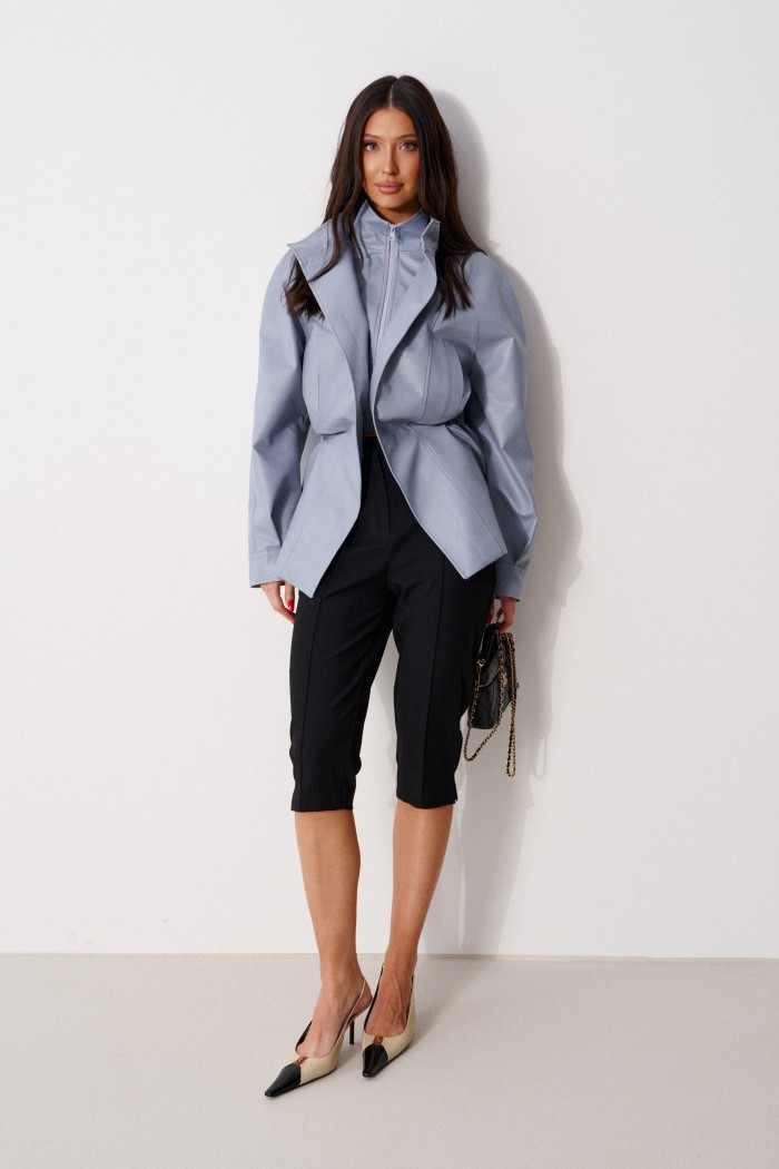 Капри прилегающего кроя, выполнены из костюмной ткани черного цвета. Характеристики: прилегающий крой, пояс стабильный, застежка на молнии с пуговицей, на задней части изделия имитация карманов, по передней и задней части брюк застроченные стрелки, в боковых швах низа брючин есть разрезы. Длина по боковому шву 72 см.