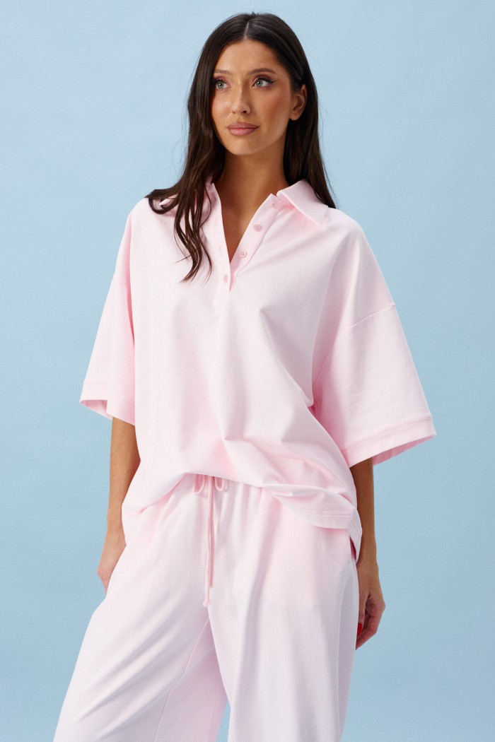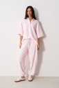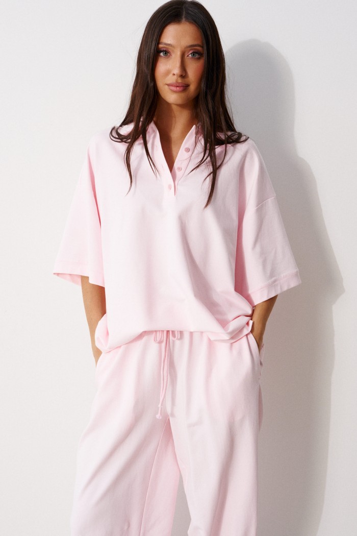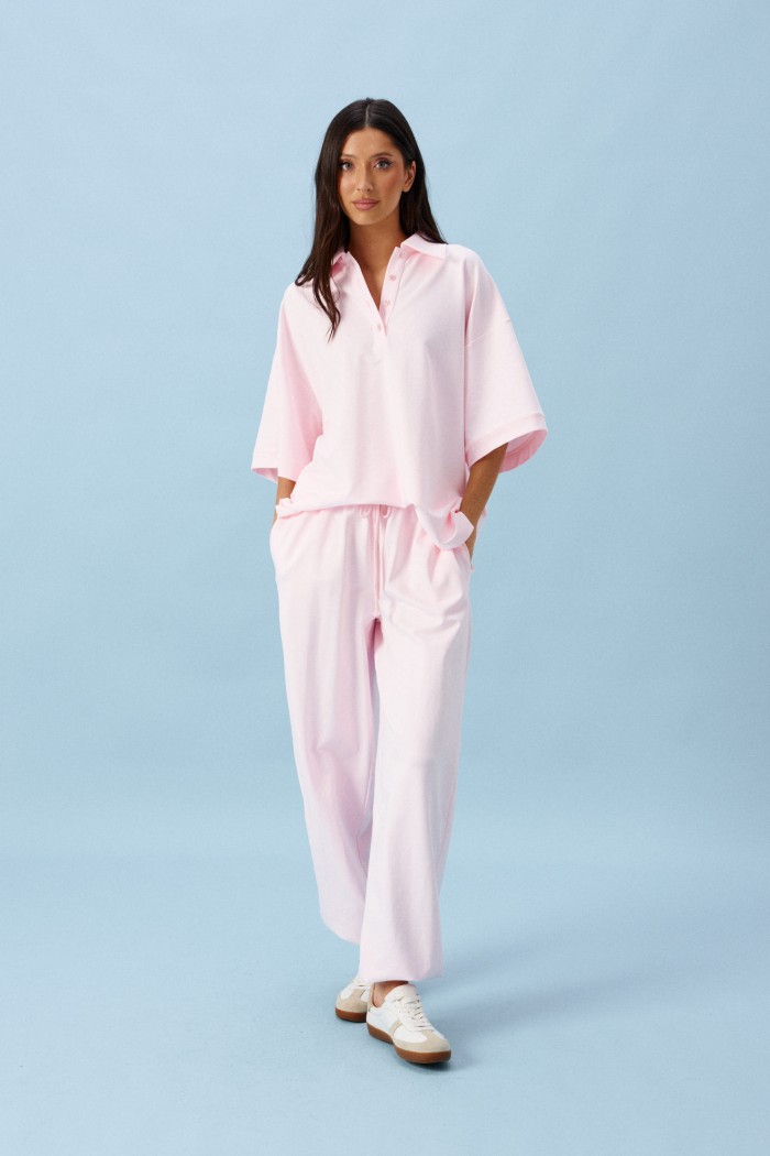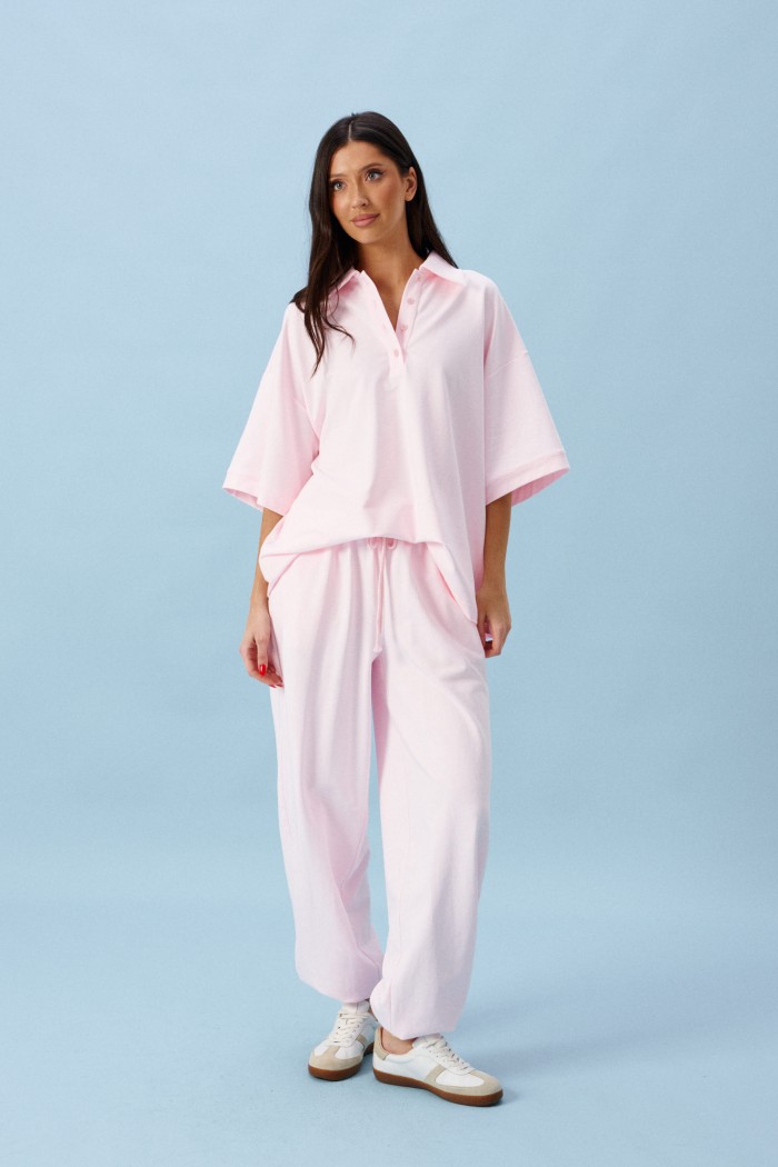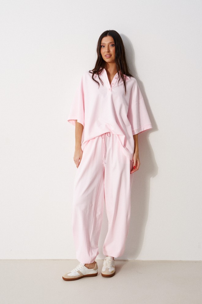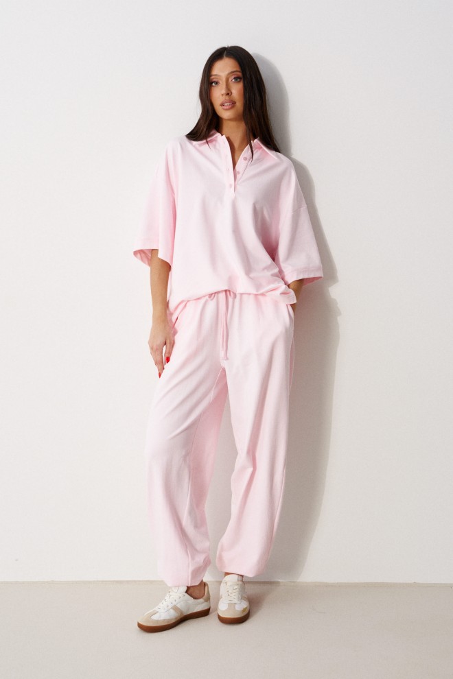 Брюки-джоггеры выполнены из трикотажного полотна нежно-розового цвета. Характеристики: прямой крой, пояс на резинке с кулиской, в боковых швах карманы, штанины внизу на резинке.