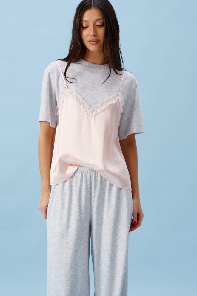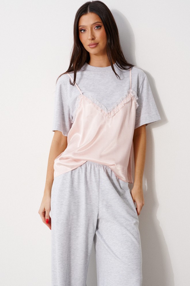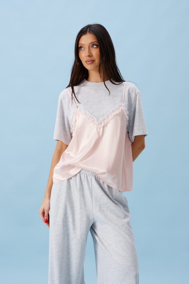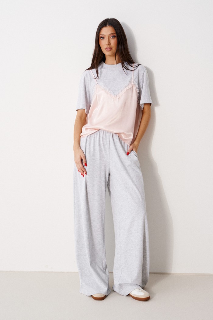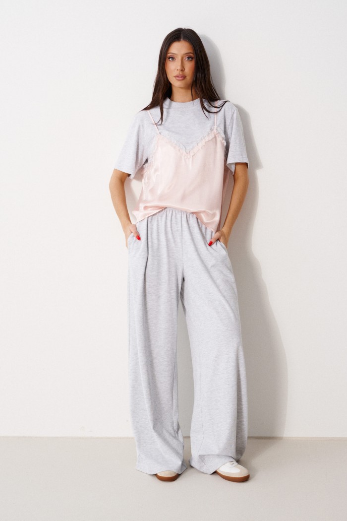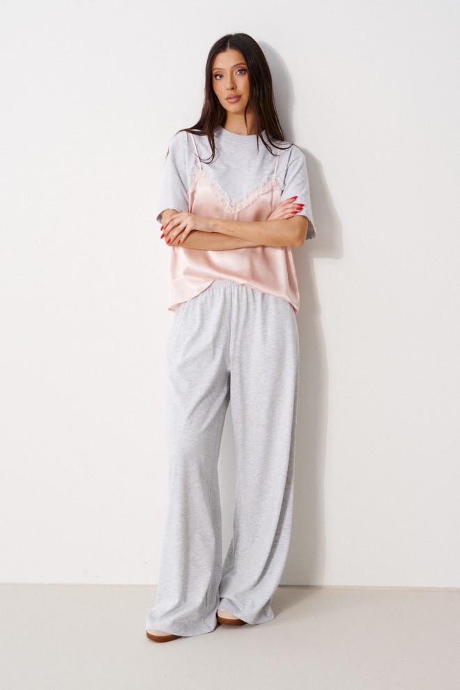 Брюки прямого, свободного кроя выполнены из трикотажного полотна серого цвета. Характеристики: прямой крой, пояс на резинке, в боковых швах карманы. Длина брюк 109 см