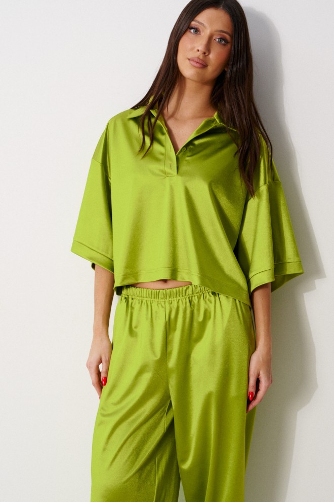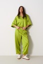 Брюки-джоггеры, выполнены из трикотажа ярко-салатового цвета. Характеристики: прямой крой, пояс на резинке, в боковых швах карманы, штанина внизу на резинке, есть накладные карманы сзади. Длина по боковому шву 106 см.