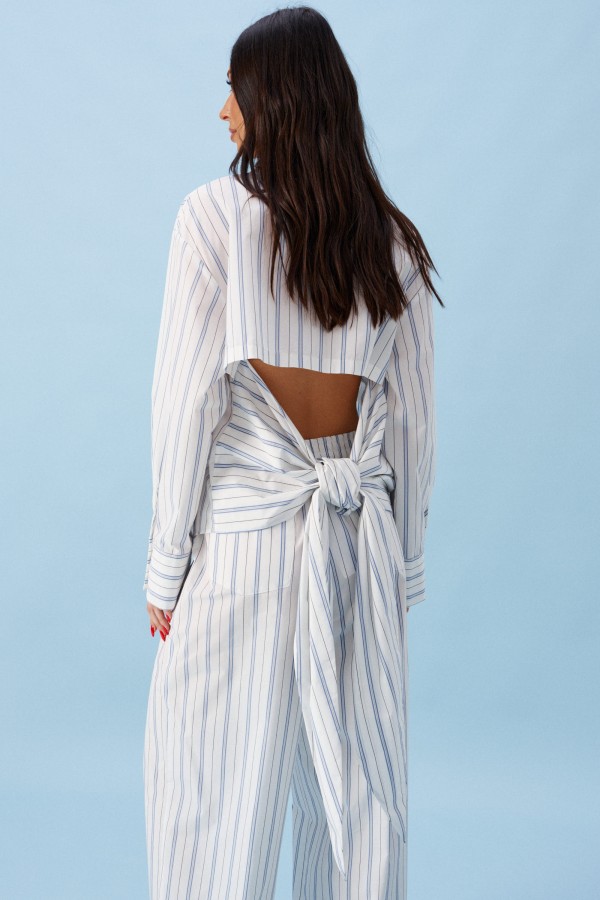 Брюки прямого кроя выполнены из хлопкового полотна белого цвета в голубую и черную полоску. Характеристика: в боровых швах карманы с отрезными бочками, по переднему шву сидения имитацияя застежки-гульфик с пришивными пуговицами, по задним половинам накладные фигурные каманы, пояс отрезной, присборен на резинку. Длина изделия 110см.