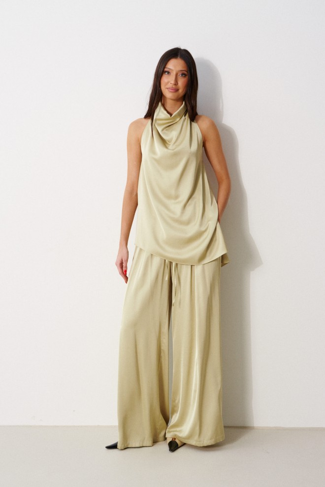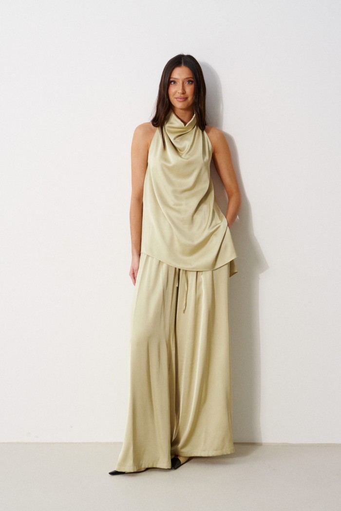 Брюки свободного кроя. Выполнены из мягкой струящейся ткани оливкового цвета. Пояс на резинке, со шнурочком. В боковых швах карманы. Длина бокового шва (с учётом пояса) 109 см
