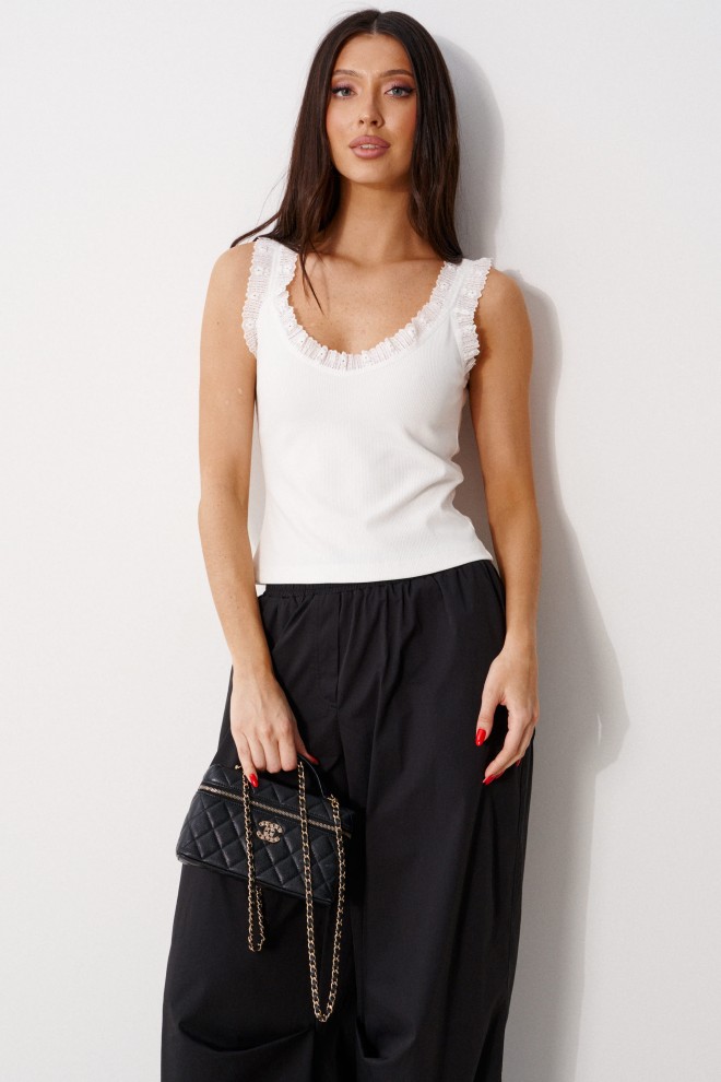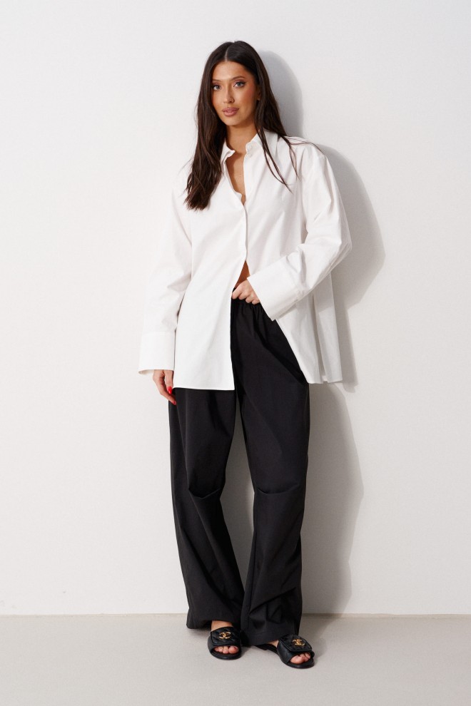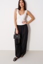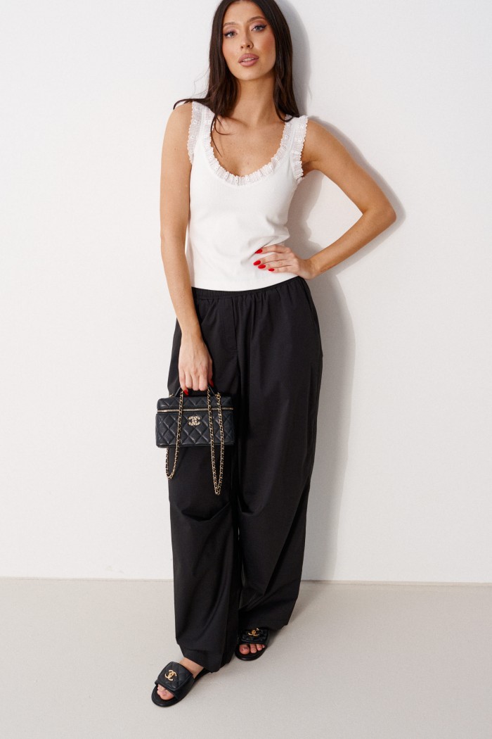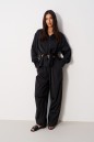 Брюки свободного прямого кроя. Выполнены из полотна чёрного цвета. Пояс на резинке, имитация гульфика, во внутреннем боковом шве на уровне колена защип. В боковых швах карманы, по задней части накладные функциональные карманы. Длина по боковому шву 107см.