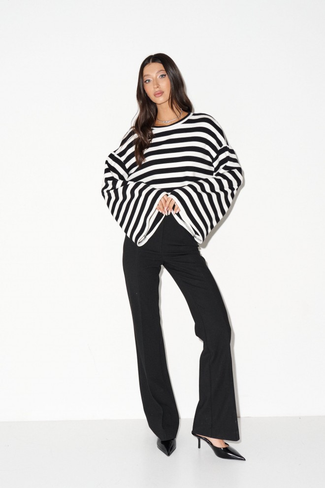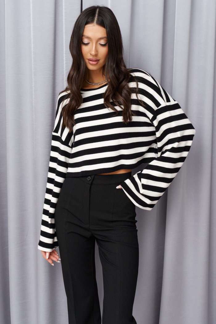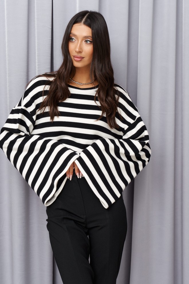 Джкмпер выполнен из трикотажного чёрно-белого полотна. Характеристики: свободный прямо крой, длина укороченная, широкий спущеный рукав. Длина по спинке 42 см. Длина рукава от горловины 77 см.