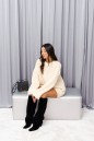 Джемпер прямого свободного кроя. Выполнен из мягкой фактурной ткани цвета айвори. Горловина овальная. Рукав втачной, спущенный. Длина спинки от края горловины 50 см (замер выполняется по центру горловины), длина рукава от линии втачивания 47 см (от горловины 67 см). Образ дополнят шорты А1383