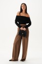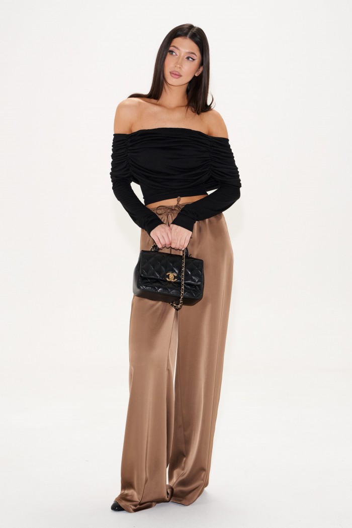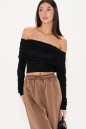 Джемпер из мягкого тонкого трикотажа. Прилегающий силуэт. Вырез кармен. Декорирован широким воротником, переходящим на рукава, с декоративной сборкой. Передняя и задняя часть изделия симметричны. Длина спинки 34 см, длина рукава от линии воротника 60 см