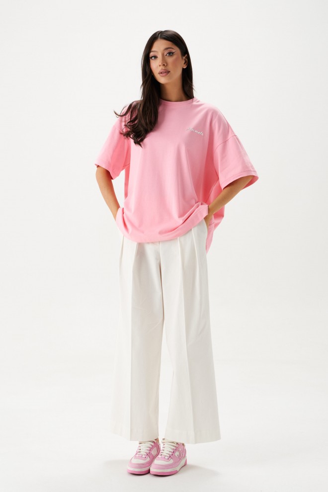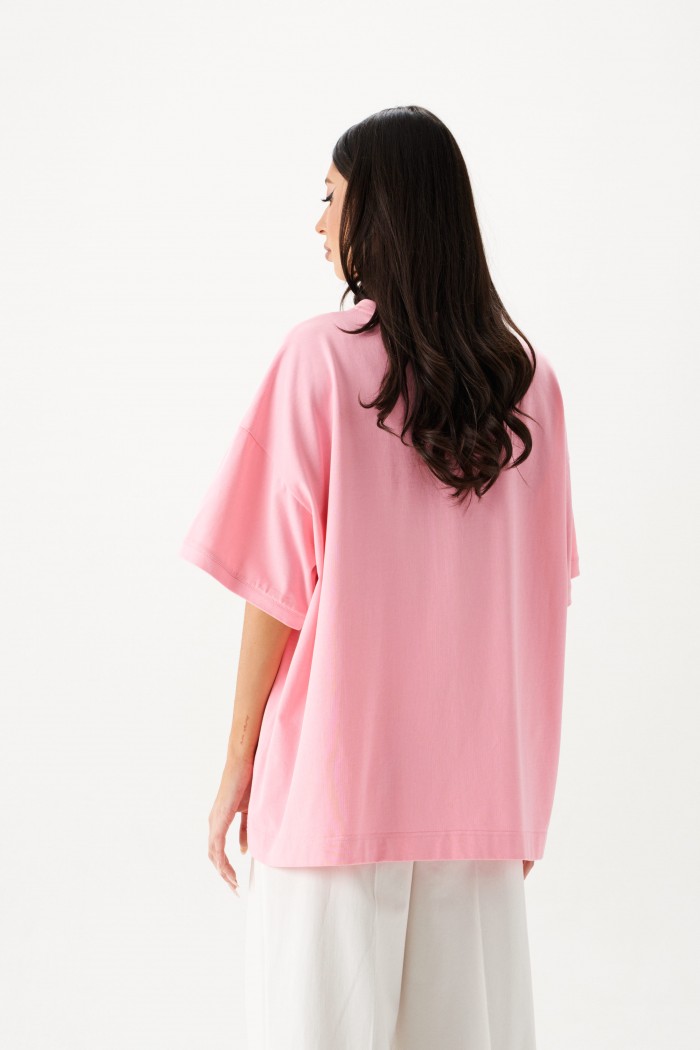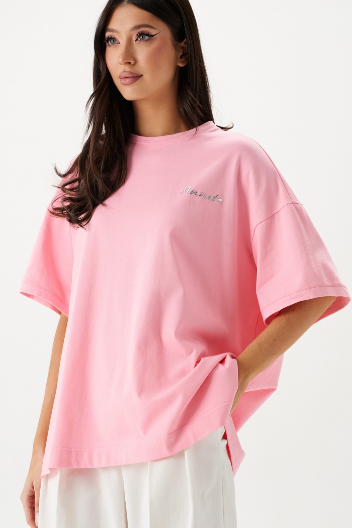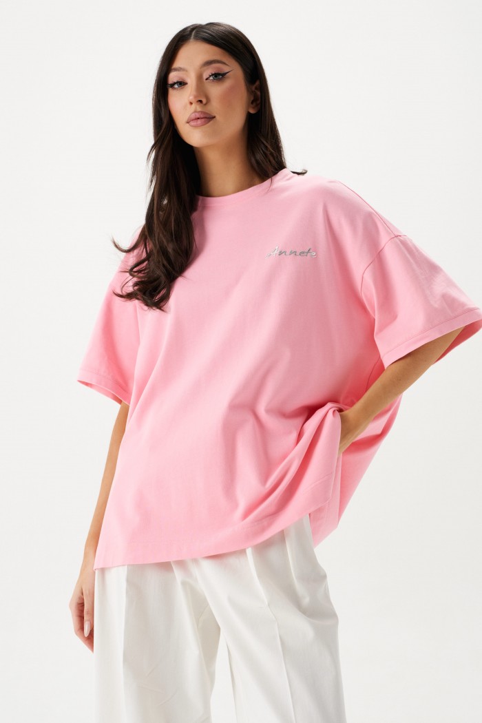 Футболка прямого свободного кроя, выполнена из хлопкового полотна розового цвета. Характеристики: прямой свободный крой, горловина овальная, рукав слегка спущен, горловина и край рукава выполнены из довяза, по передней части изделия слева декоративная объемная печать "Annete". Длина по центру спинки 69 см, длина рукава 18 см.