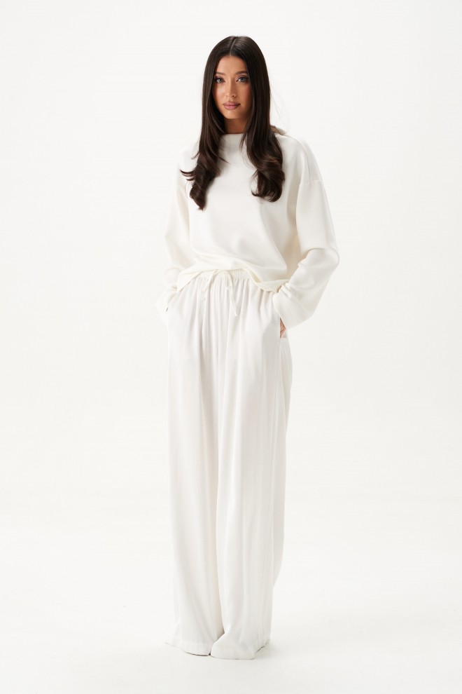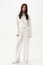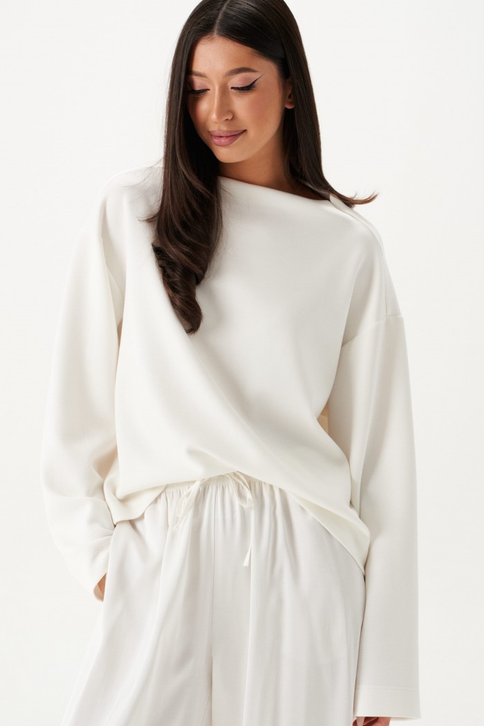 Джемпер прямого свободного кроя выполнен из трикотажного полотна молочного цвета. Характеристики: прямой крой, цельнокройная горловина стойка, втачной рукав свободного кроя, по низу изделия отделочная строчка. Длина по спинке 61 см, длина рукава от горловины 77 см.