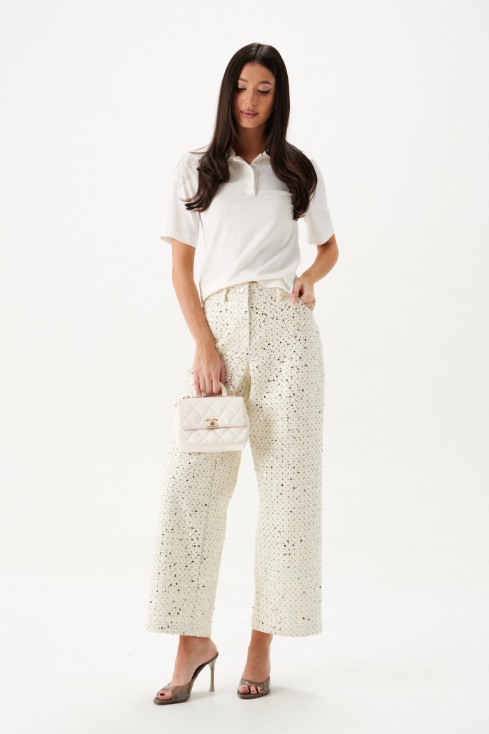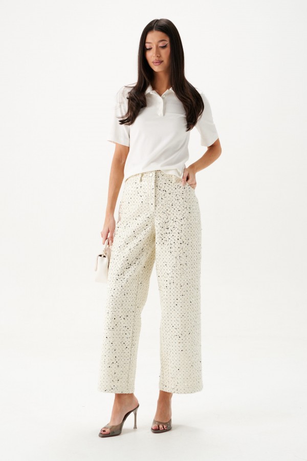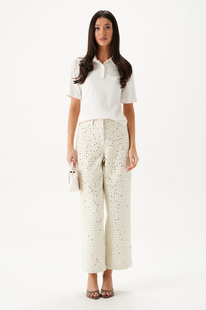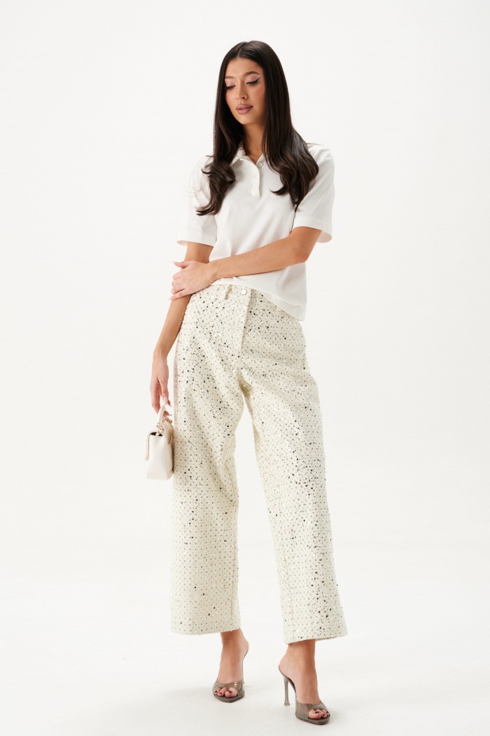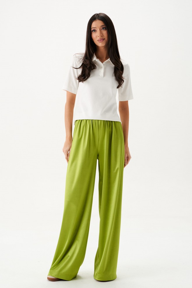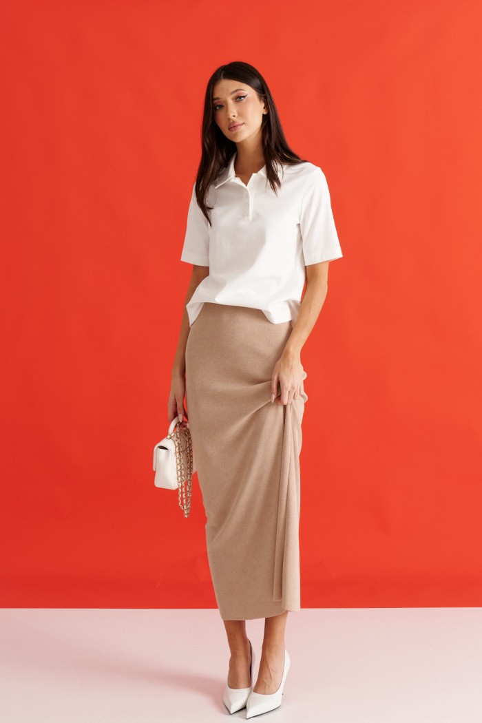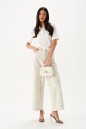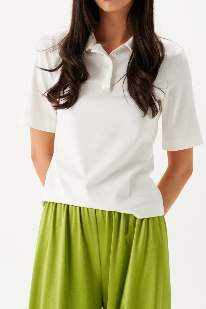 Джемпер прямого кроя. Выполнен из трикотажного полотна белого цвета. Отложной воротник. В области горловины застежка на планке на петли пуговички. Рукав втачной, короткий, длина рукава от края горловины 37 см. Длина спинки от края горловины 55 см