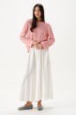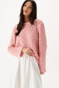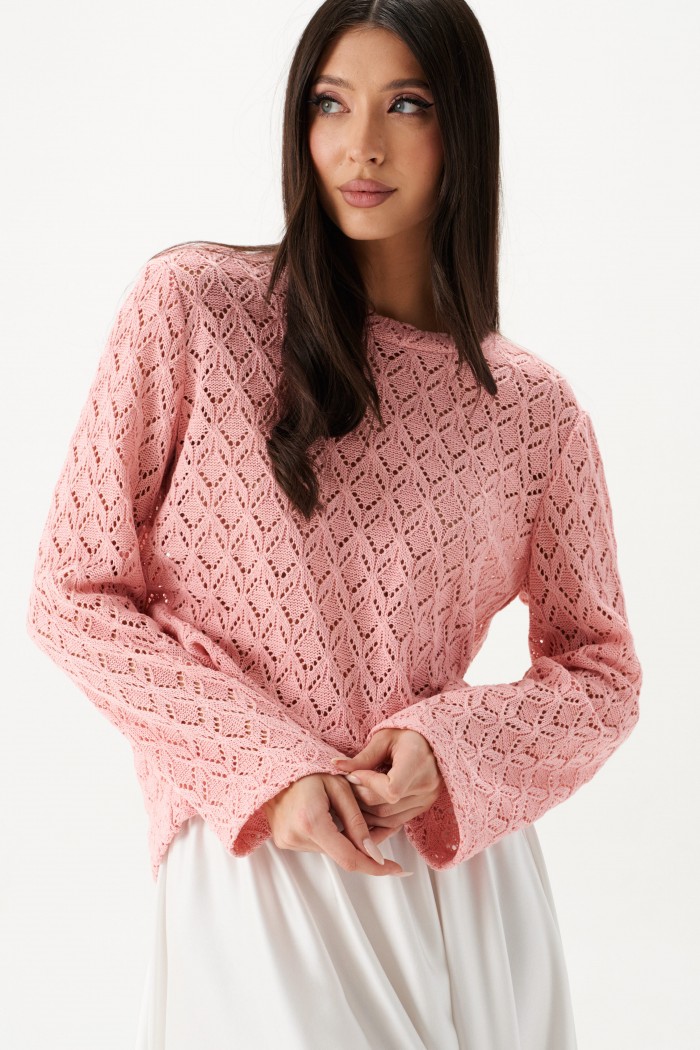 Джемпер выполнен из трикотажного полотна узорной вязки, розового цвета.