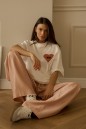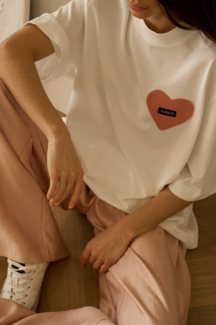 Футболка прямого кроя, выполнена из полотна счетлого цвета. Характеристика: прямой крой, горловина овальная с довязом, спереди брендированная апликация в виде сердца, рукав втачной. Длина рукава 29 см. Длина спинки 70 см.