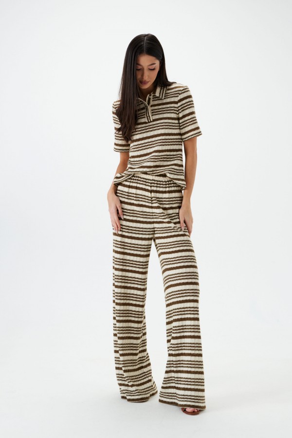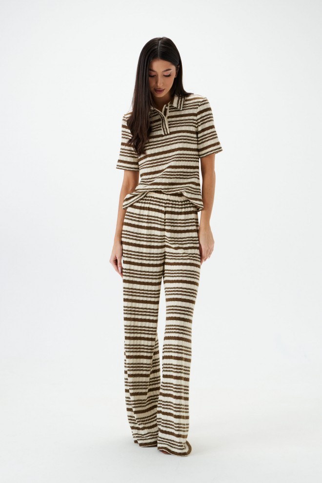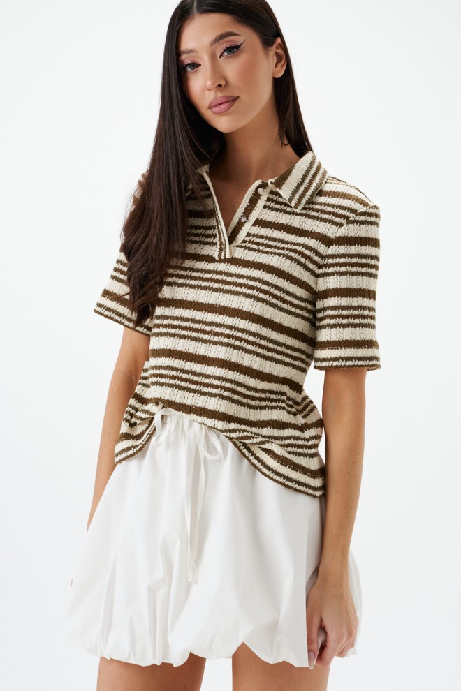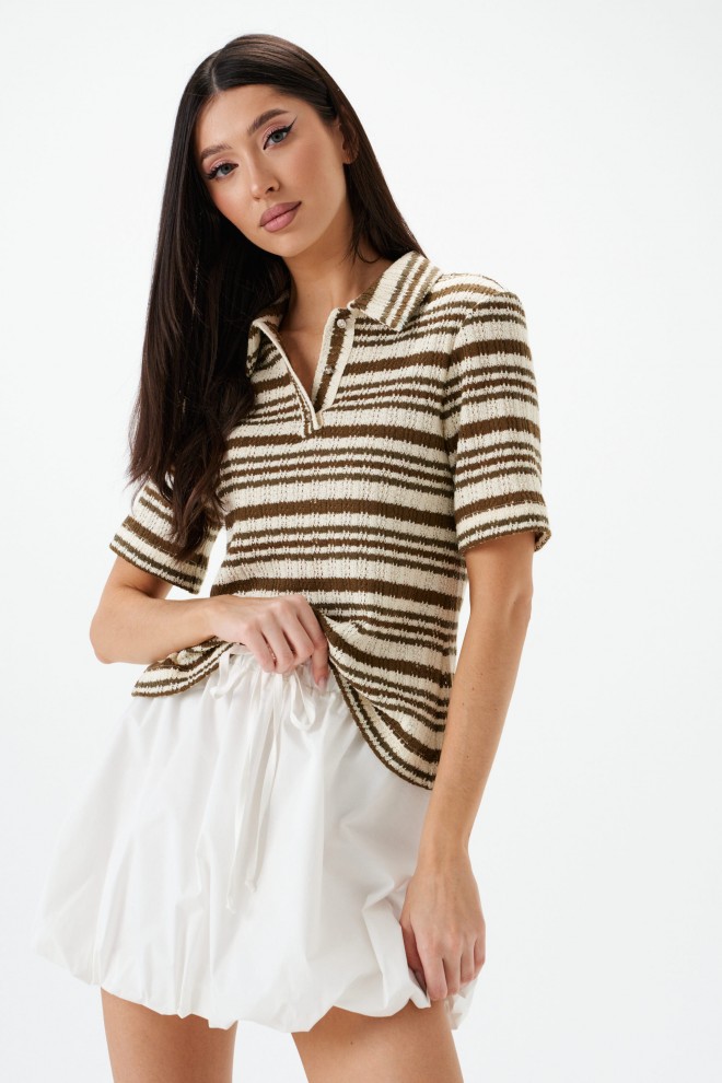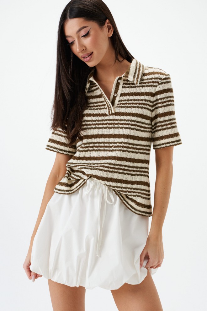 Джемпер-поло. Выполнен из мягкого вязаного трикотажа. Прямой крой. Отложной воротник. Застёжка – пуговички. Рукав втачной. Длина рукава 25 см. Длина спинки 54 см