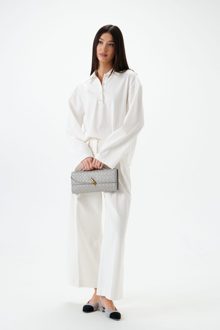Джемпер-поло. Выполнен из трикотажного полотна. Прямой крой. Отложной воротник. Застёжка – пуговички. Рукав втачной, немного спущен. Длина рукава от линии втачивания 57 см. Длина спинки 59 см
