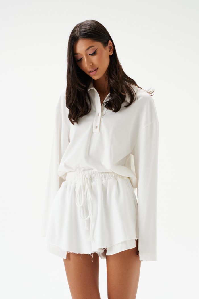 Джемпер-поло. Выполнен из трикотажного полотна. Прямой крой. Отложной воротник. Застёжка – пуговички. Рукав втачной, немного спущен. Длина рукава от линии втачивания 57 см. Длина спинки 59 см