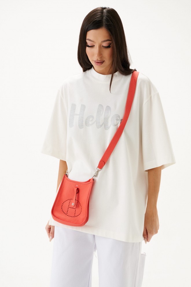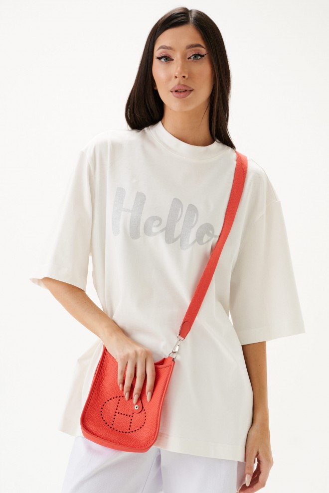 Футболка прямого свободного кроя, выполнена из хлопкового полотна тепло-белого цвета . Характеристики: прямой свободный крой, горловина круглая, рукав слегка спущен, горловина и край рукава выполнены из довяза, спереди принт серого цвета. Длина по центру спинки от края горловины 70 см, длина рукава от края горловины 45 см.