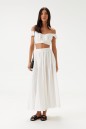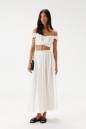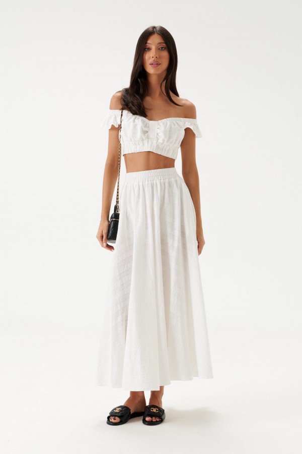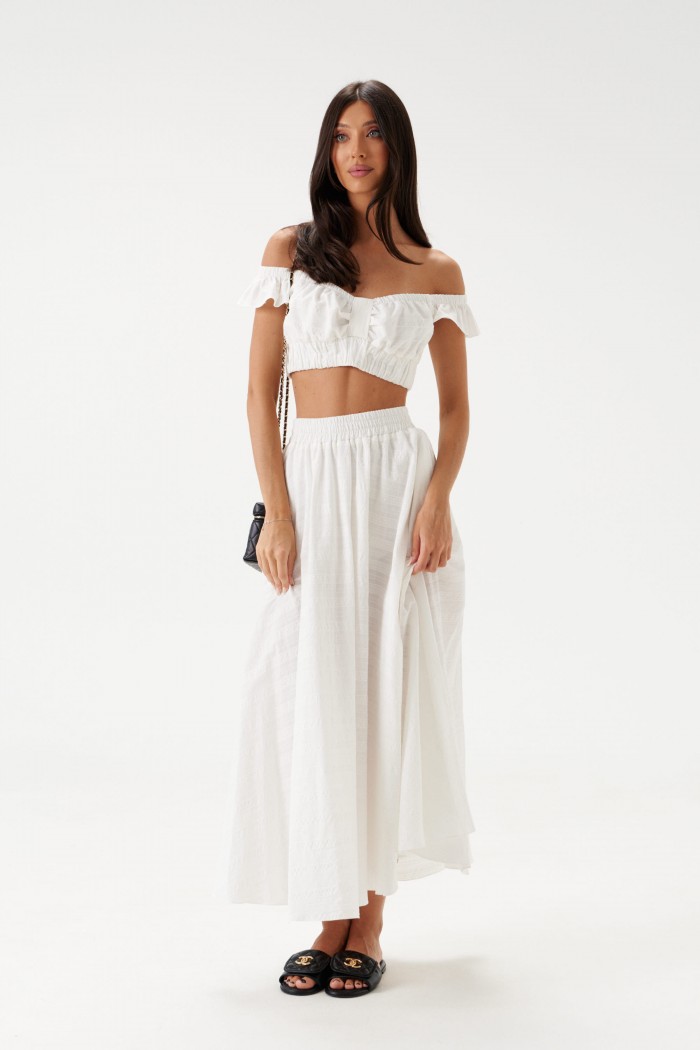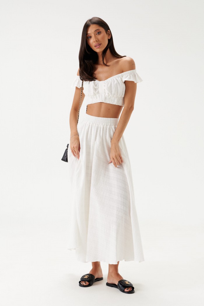 Укороченный топ, выполнен из ажурного полотна тепло-белого цвета. Характеристики: фигурный вырез горловины, по переду и по спинке лифа резинка со сборкой, бретели с резинками и декоративным элементов в виде рюш, застёжки нет, низ изделия на широкой резинке. Длина по спинке 20 см.