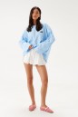 Джемпер прямого свободного кроя,выполнен из трикотажного полотна голубого цвета. Характеристики: прямой крой, овальный вырез горловины, спинка цельнокроеная, по переду брендированная нашивка. Рукав длинный спущен. Длина по спинке 73 см, длина рукава от края горловины 78см.