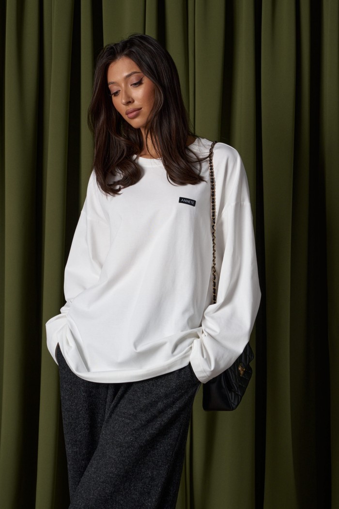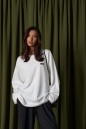 Джемпер прямого свободного кроя,выполнен из трикотажного полотна белого цвета. Характеристики: прямой крой, овальный вырез горловины, спинка цельнокроеная, по переду брендированная нашивка. Рукав длинный спущен. Длина по спинке 73 см, длина рукава от края горловины 78см.