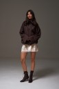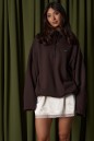 Джемпер прямого свободного кроя выполнен из хлопокового полотна двухнитки шоколадного цвета. Характеристики: прямой крой, широкий отложной воротник, центральная застежка-молния, рукав втачной спущенный, манжет на резинке с фиксаторами, по низу изделие собирается на резинку с фиксаторами. Длина рукава от края горловины 79 см, длина по спинке от шва горловины 71 см.