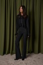 Джемпер прямого кроя, выполнен из трикотажного черного полотна. Характеристики: прямой крой, овальный вырез горловины. Линия воротника, низ изделия и манжета декорированы рюшей, застежка центральная на петли пуговицы. Длина по спинке 50см, длина рукава от края горловины 77см