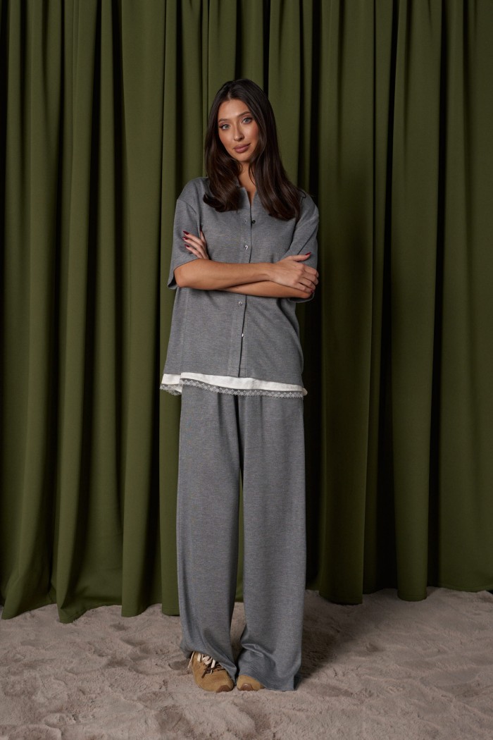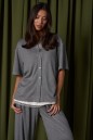 Джемпер свободного кроя, выполнен из трикотажного полотна серого цвета. Воротник отложной, центральная застежка на петли-пуговицы, чуть спущенное плечо, рукав втачной, короткий. Длина спинки 64 см. Длина рукава от линии втачивания 24 см