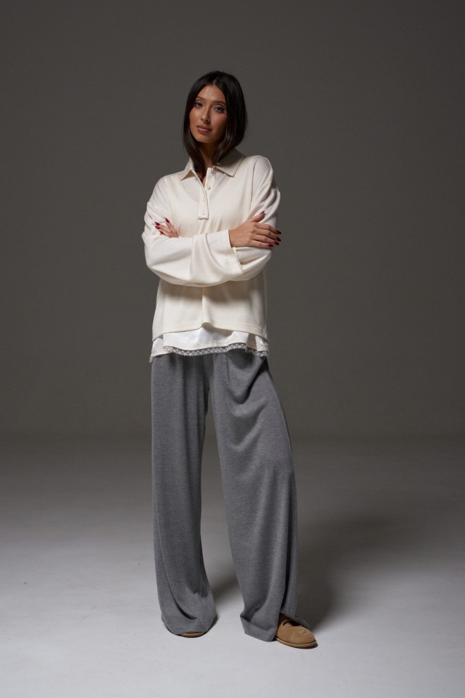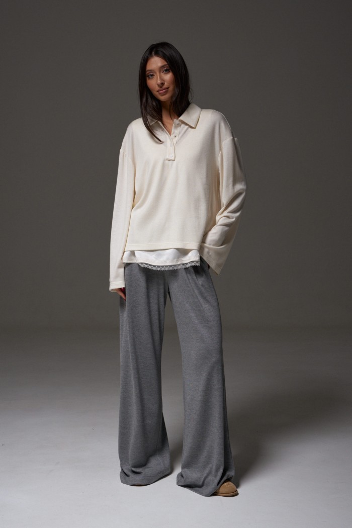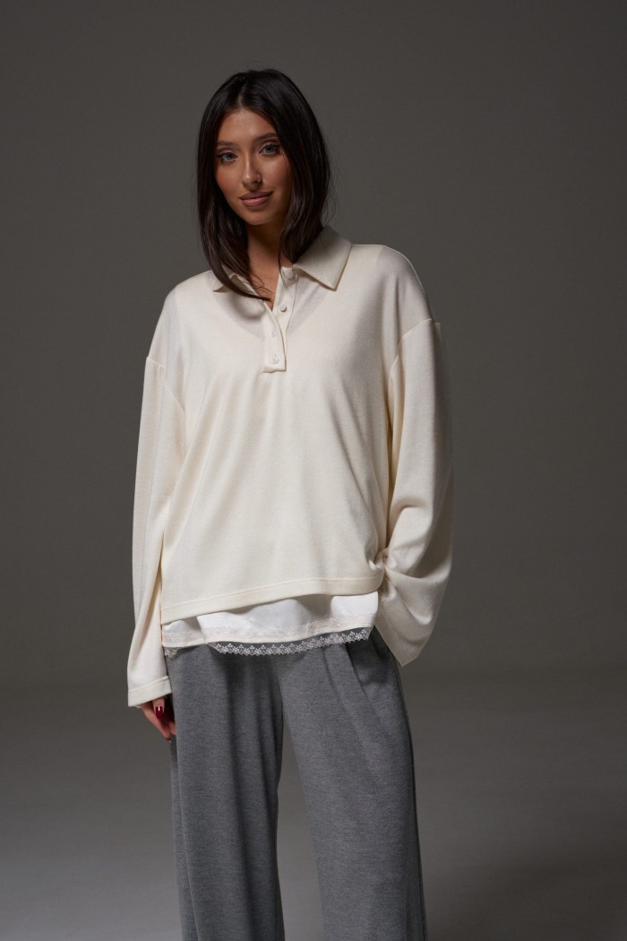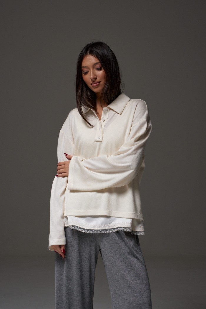 Джемпер-поло. Выполнен из трикотажного полотна в нежно-сливочном оттенке. Характеристика: прямой крой, отложной воротник, центральная застёжка на пуговички, рукав втачной и немного спущен. Длина рукава от края горловины 78 см. Длина спинки от края горловины 60 см.