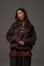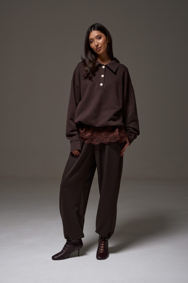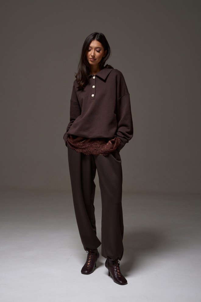 Джемпер свободного кроя. Выполнен из плотного трикотажного полотна шоколадного цвета. Воротник отложной. Застёжка центральная - акцентные пуговицы. Рукав спущенный, с манжетой. Низ изделия на резинке, регулируется. Длина рукава от линии втачивания 59 см. Длина спинки 70 см