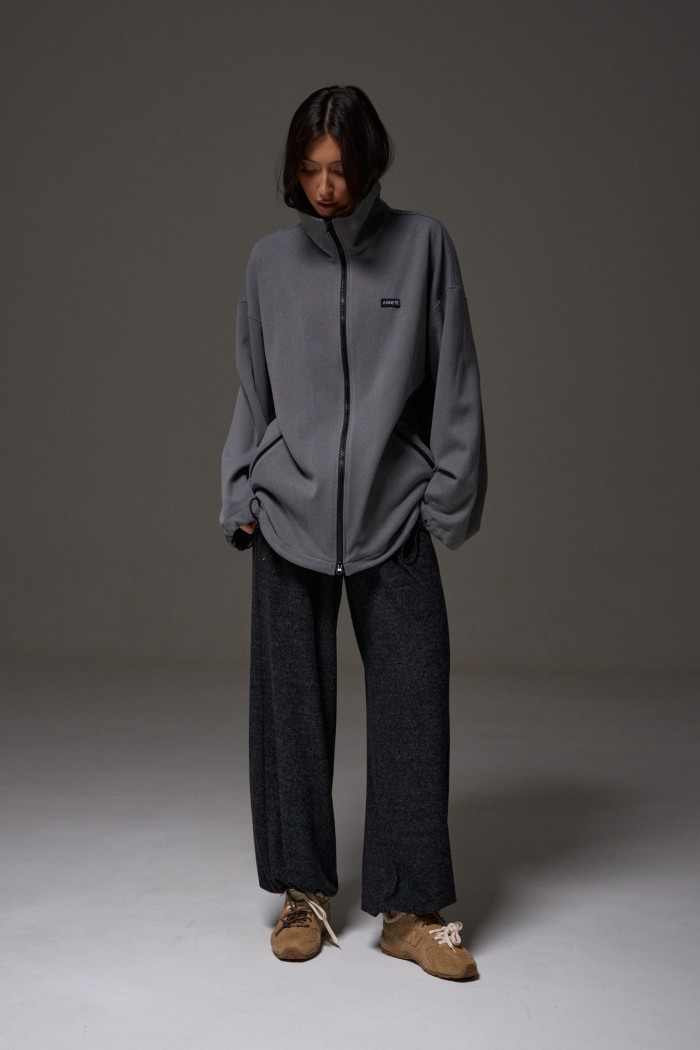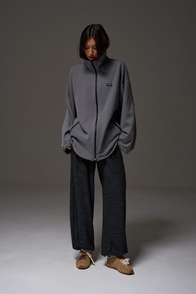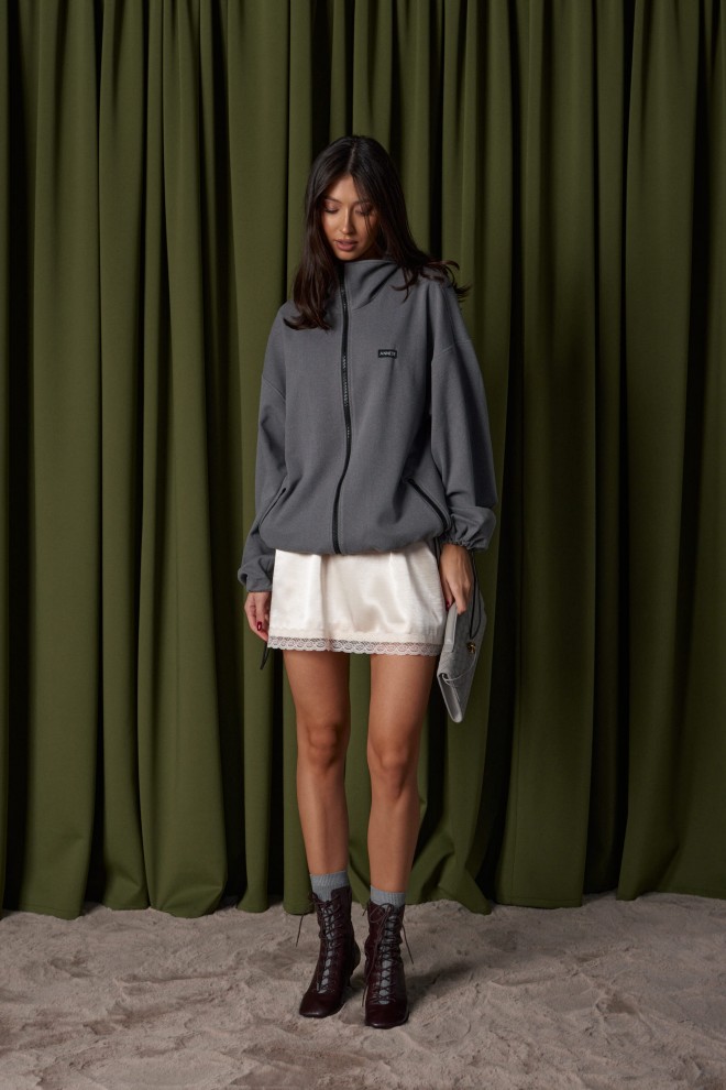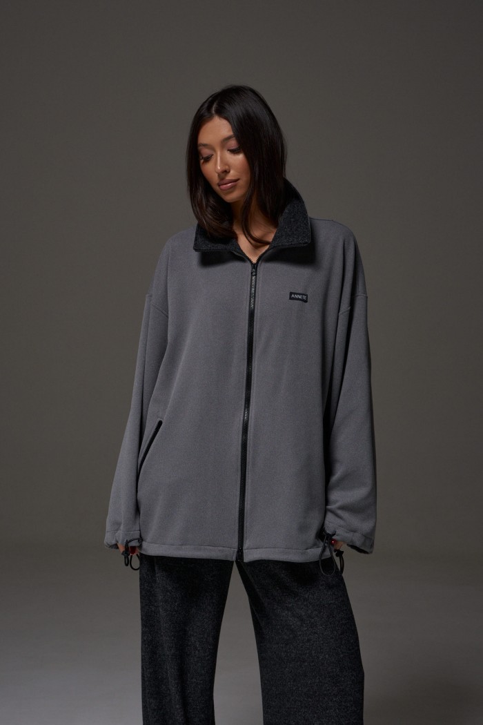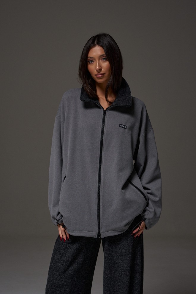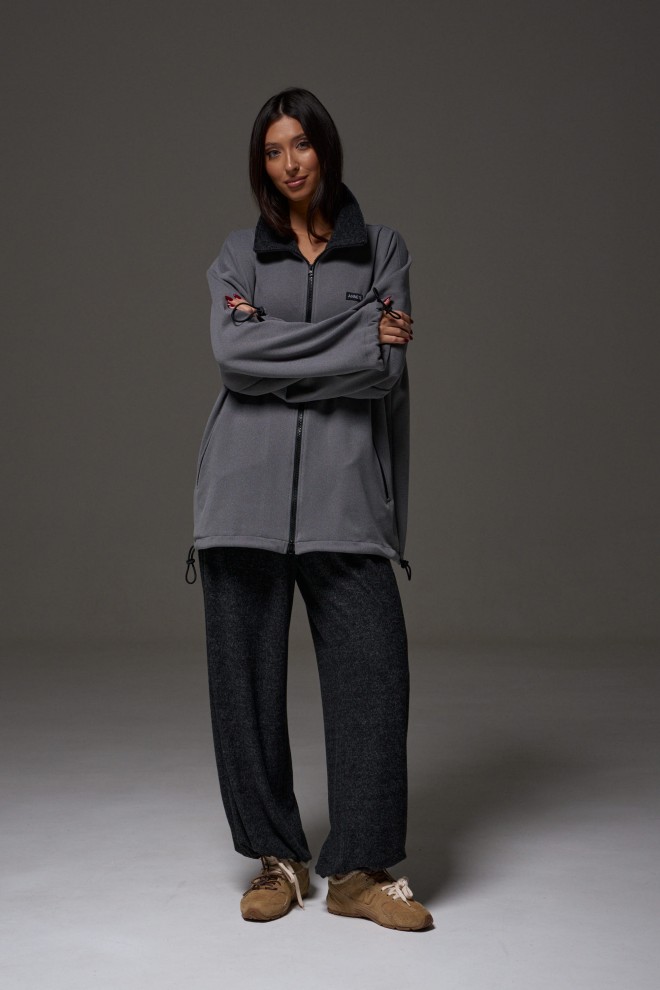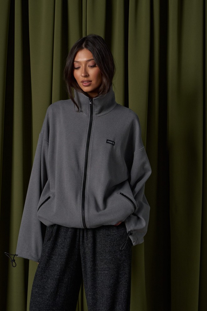 Джемпер прямого силуэта, выполнен из трикотажного полотна серого цвета. Характеристики: горловина круглая, воротник стойка черного цвета, рукав втачной, спущен, по низу рукава кулиса с втянутым шнуром-резинкой, регулируемой фиксаторами, прорезные карманы на молниях, спереди брендированная нашивка. Застежка центральная на молнию. По низу изделия кулиса с втянутым шнуром-резинкой, регулируемой фиксаторами. Длина изделия по спинке 73 см, длина рукава от горловины 81 см.