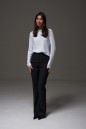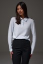 Джемпер-поло прямого кроя. Выполнен из фактурного трикотажа голубого цвета. Воротник отложной. Застёжка пуговички на планке. Рукав втачной, длинный. Длина спинки 55см. Длина рукава от линии втачивания 64 см