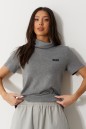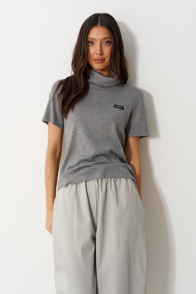 Джемпер прямого кроя. Выполнен из мягкого трикотажа серого цвета. Без подкладки. Воротник стойка. Рукав втачной. По переду слева на уровне груди брендированная нашивка. Длина рукава от линии втачивания 20 см. Длина спинки 53 см