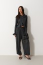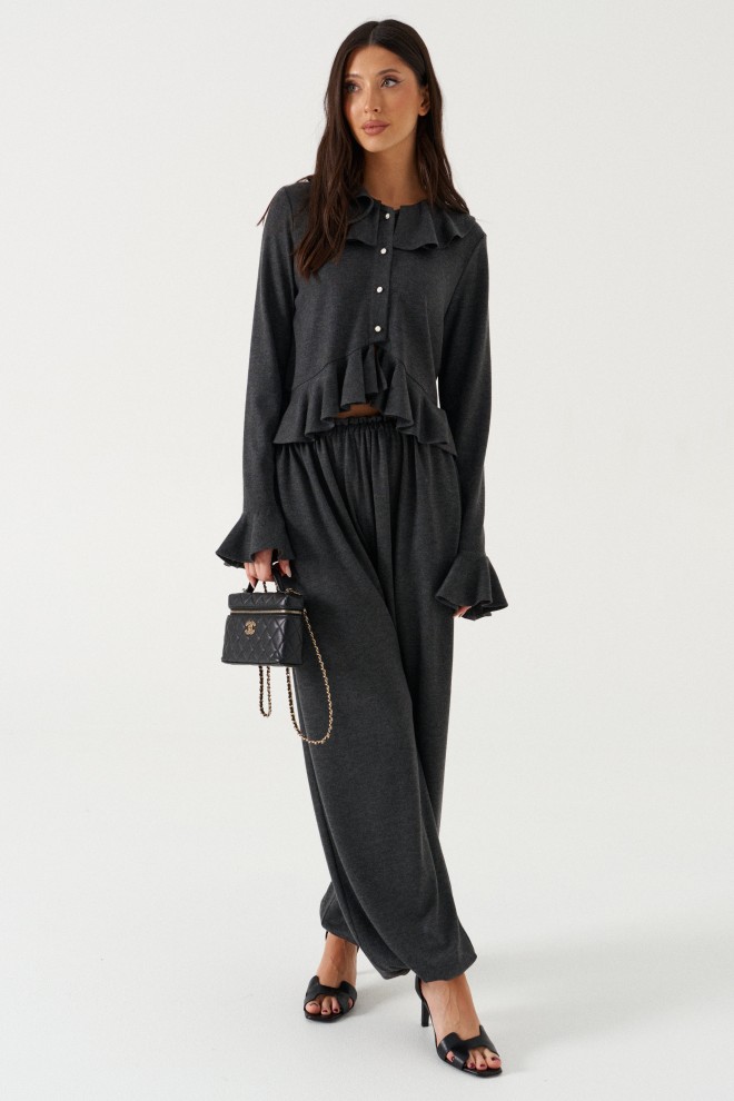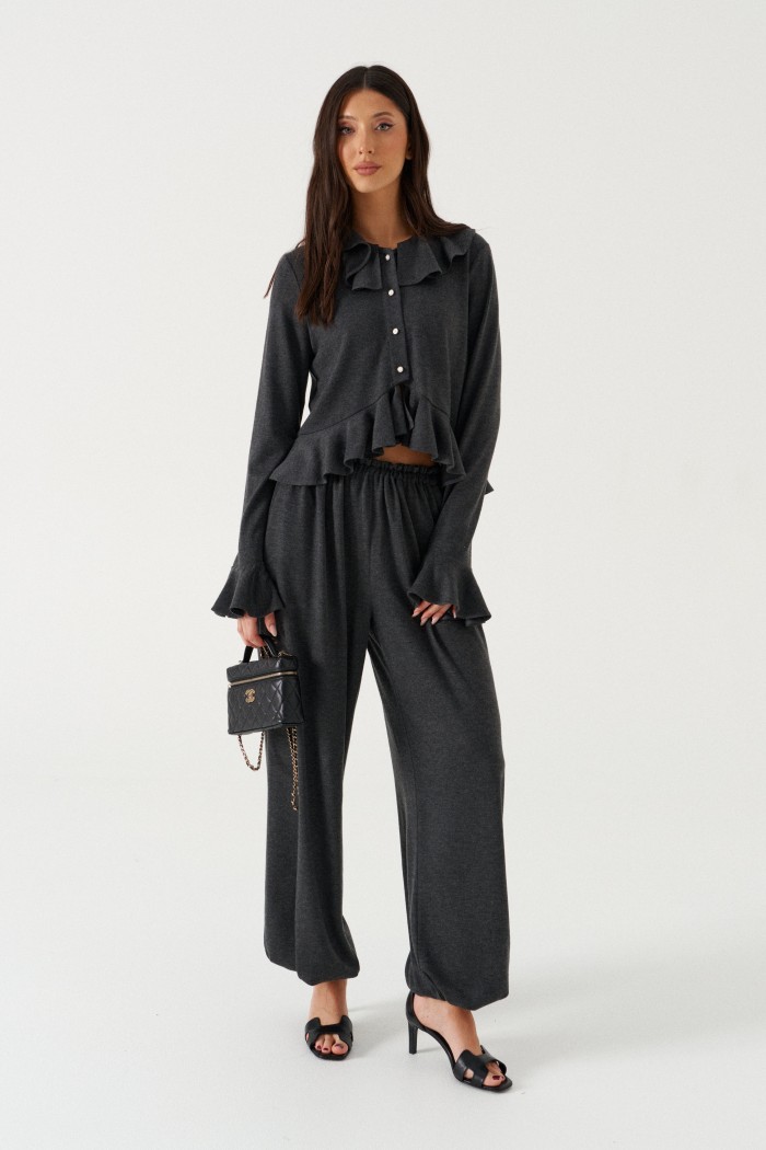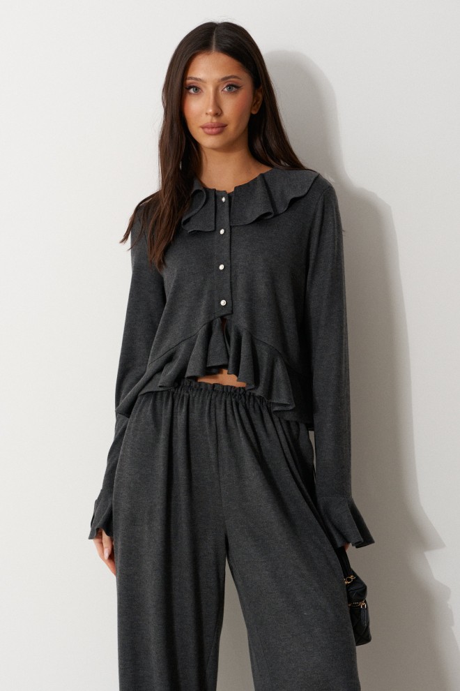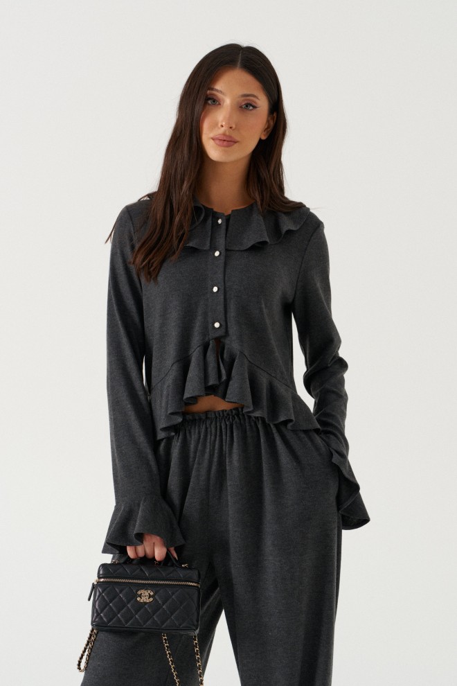 Джемпер прямого силуэта с воланом по низу. Выполнен из трикотажного полотна в графитовом оттенке. Характеристика: вырез горловины круглый, с воланом по всей окружности. Рукав одношовный, втачной. По низу притачана манжета в виде волана. Застежка центральная, по цельнокроенной планке на пробивные петли и пришивные пуговицы. Длина по спинке 50 см, длина рукава от края горловины 77 см.