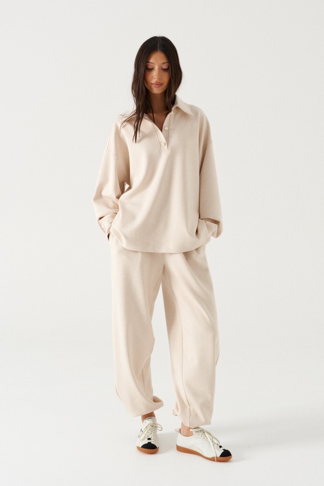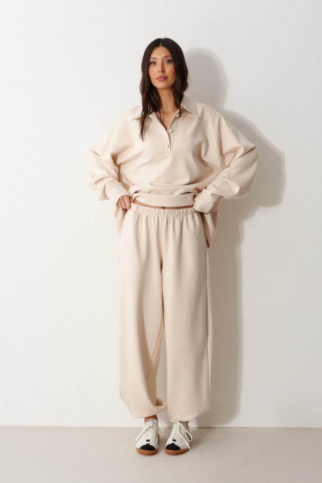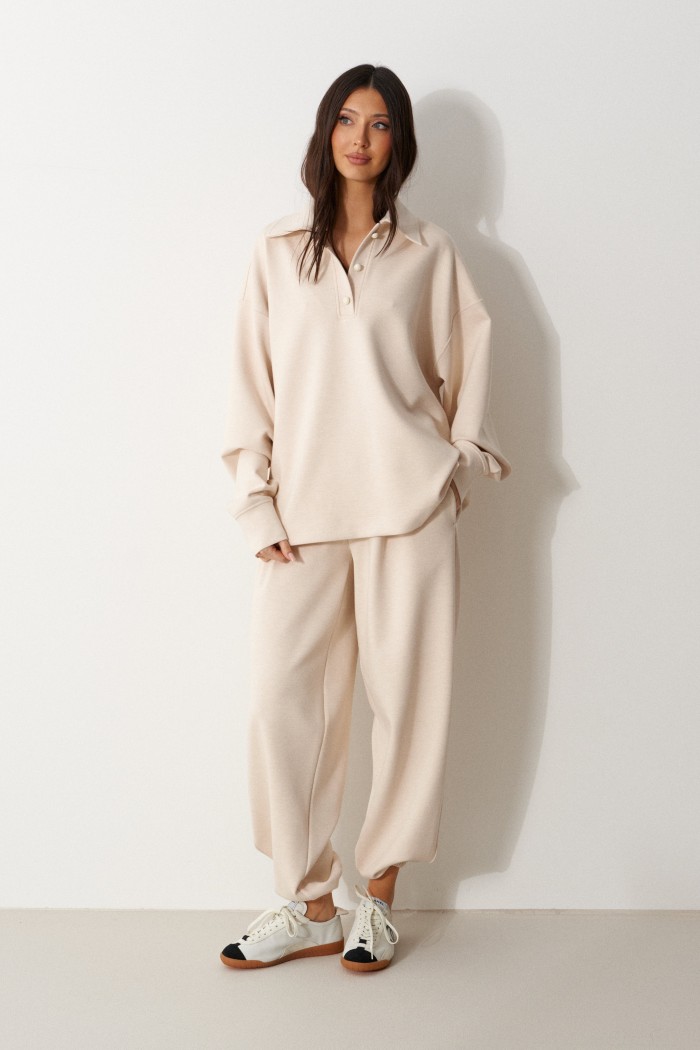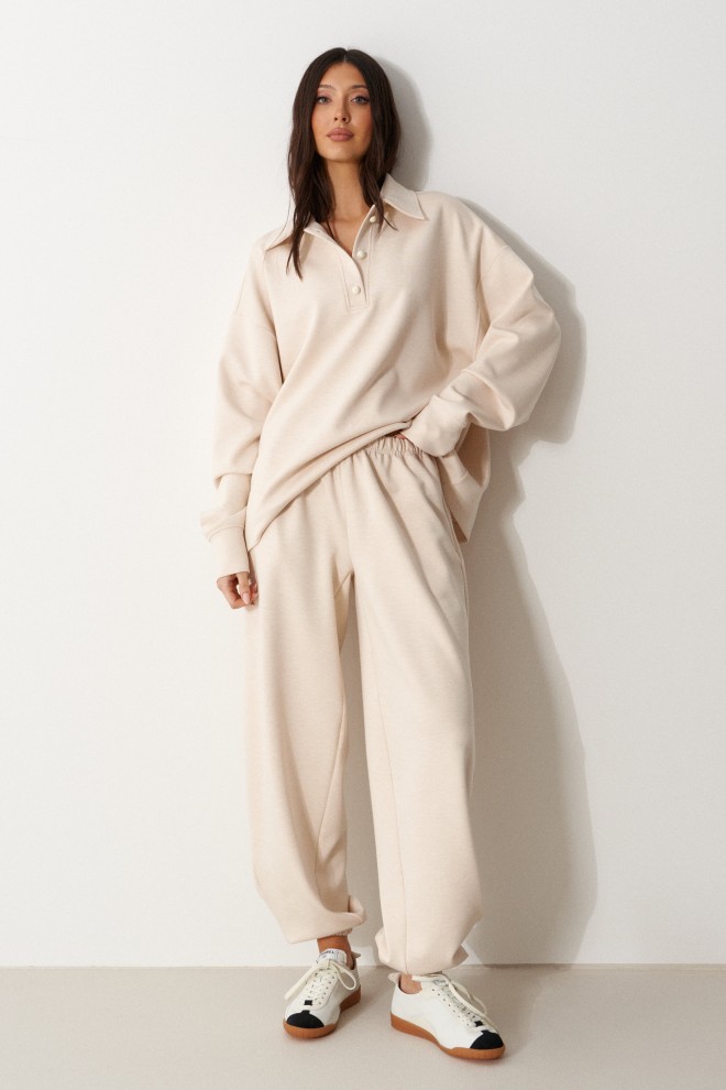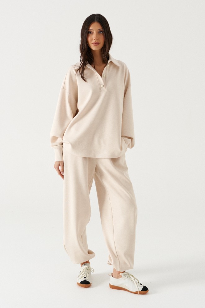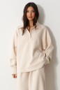 Джемпер свободного кроя выполнен из плотного трикотажного полотна бежевого цвета. Характеристики: прямой крой, воротник отложной, застёжка центральная - пуговицы, рукав спущенный с манжетой, низ изделия обработан на подгибку. Длина рукава от линии втачивания 60 см. Длина спинки 67 см.