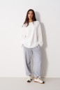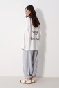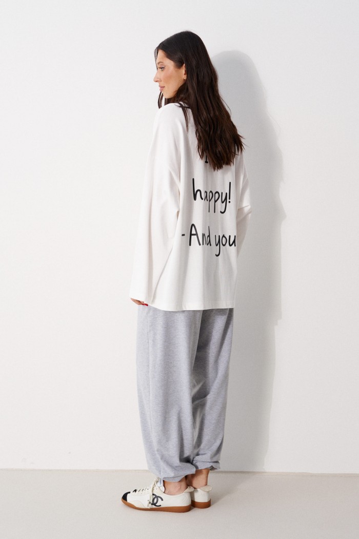 Джемпер прямого свободного кроя,выполнен из трикотажного полотна белого цвета. Характеристики: прямой крой, овальный вырез горловины, горловины из довяза, спинка цельнокроеная, Принт "I'm happy! And you?", спущенное плечо, вточной длинный рукав. Длина по центру спинки 70 см, длина рукава от края горловины 76см.