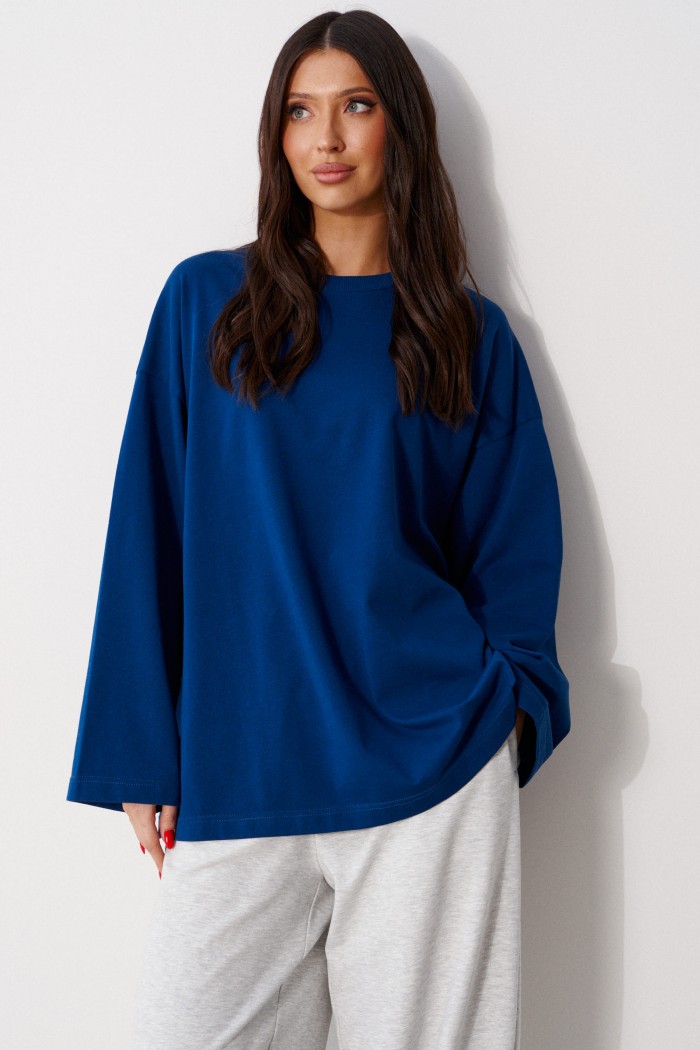 Джемпер прямого свободного кроя,выполнен из трикотажного полотна синего цвета. Характеристики: прямой крой, овальный вырез горловины, горловины из довяза, спинка цельнокроеная, Принт "I'm happy! And you?", спущенное плечо, вточной длинный рукав. Длина по центру спинки 70 см, длина рукава от края горловины 76см.